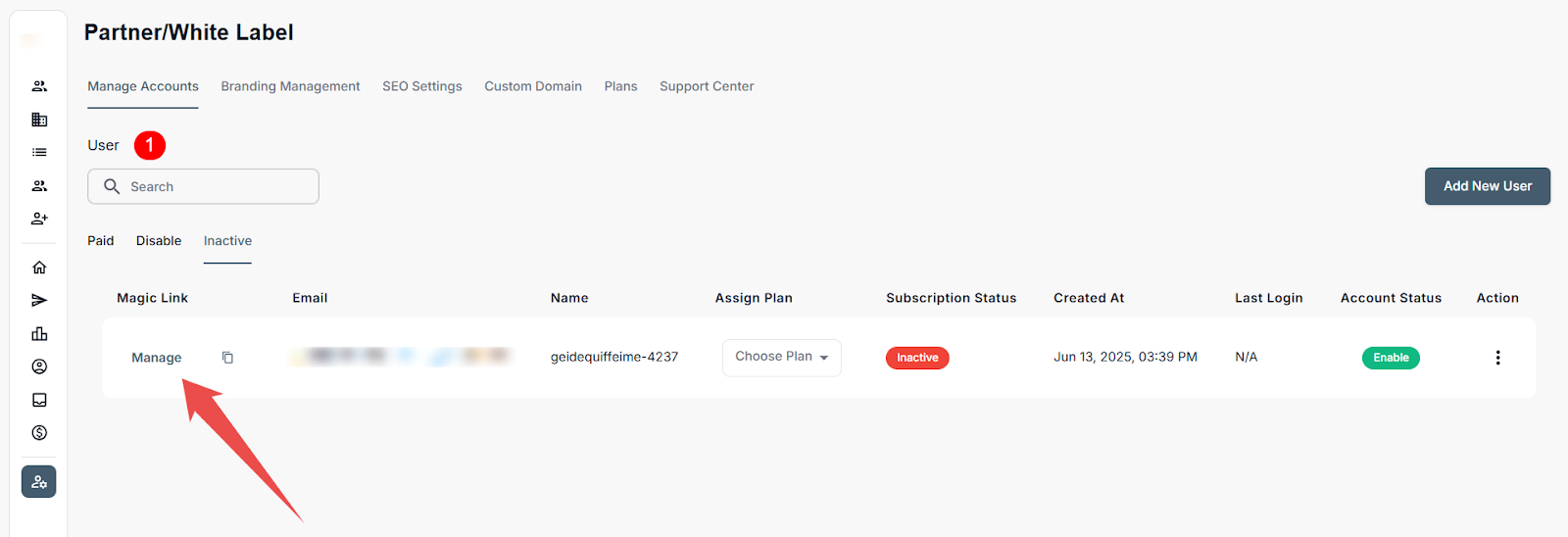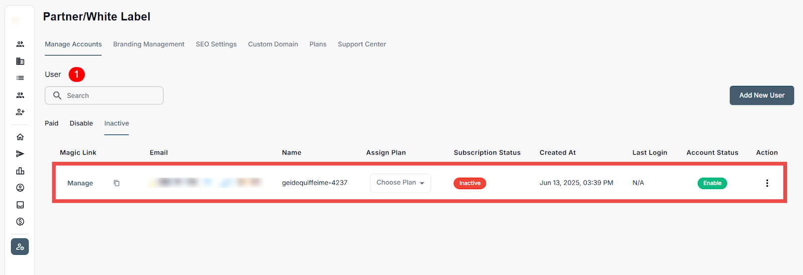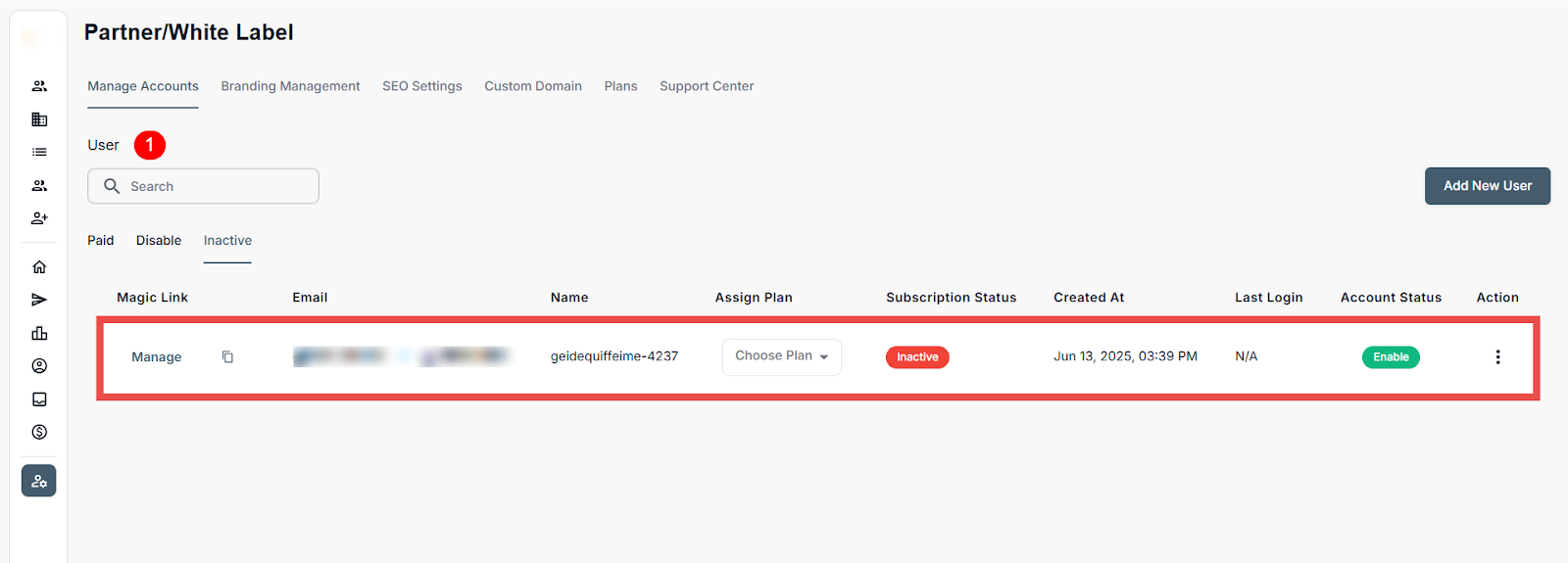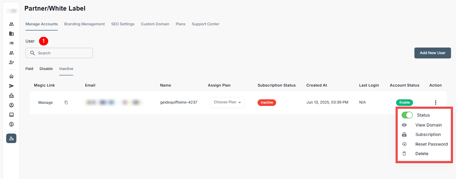 Administrators in the Partner/White Label portal can add/invite new users, assign subscription plans, monitor activity, and manage account access from a centralized dashboard. This includes onboarding users as well as performing key actions like enabling or disabling accounts, resetting passwords, and removing users to ensure appropriate access and alignment with operational needs.