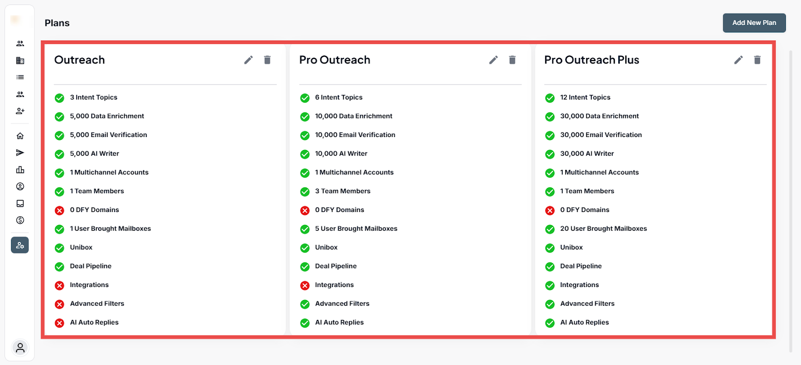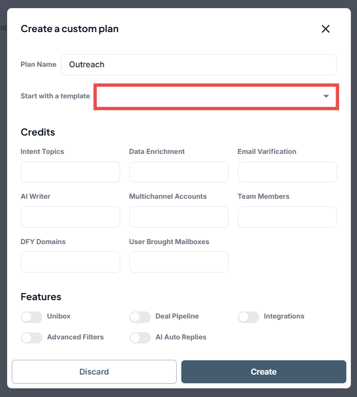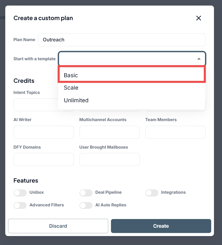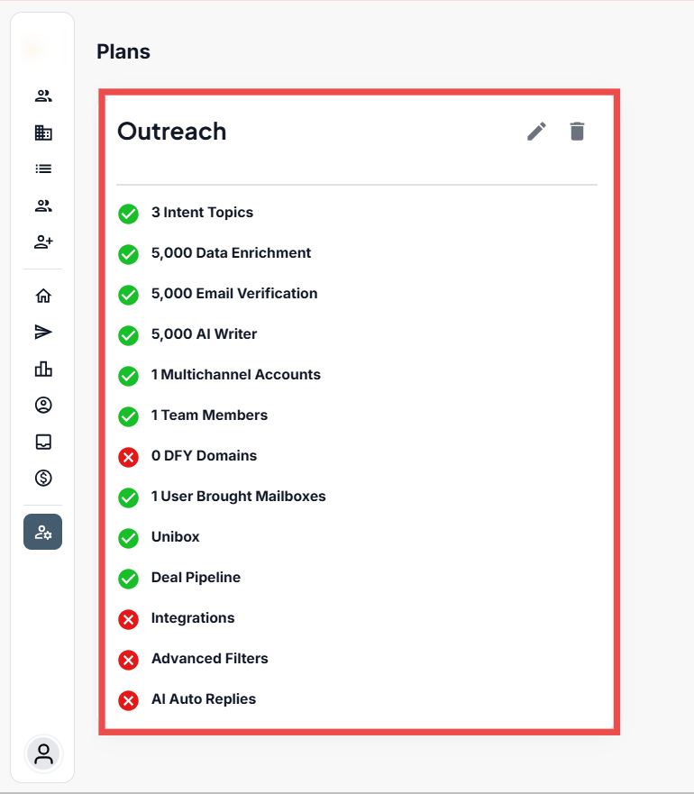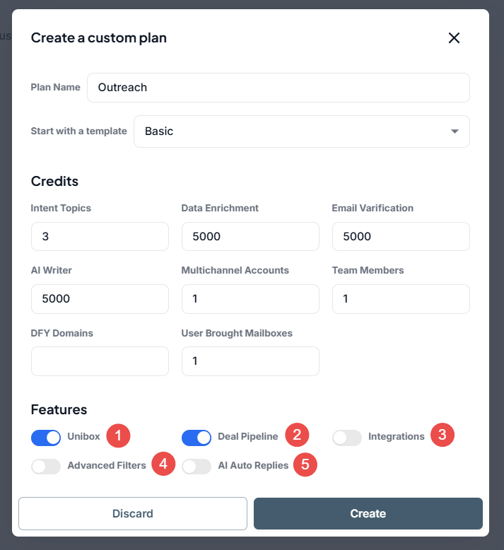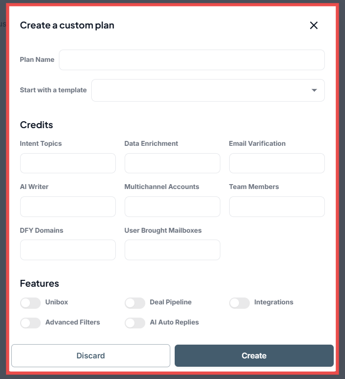 Enable or disable specific platform features such as Unibox, Deal Pipeline, Integrations, and AI Auto Replies to customize the plan’s functionality.