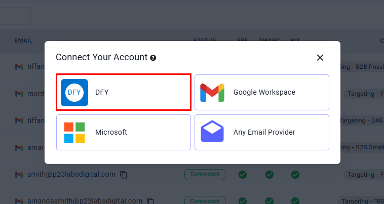 A modal window titled "Connect Your Account" will appear, where you can select DFY as the email service provider.