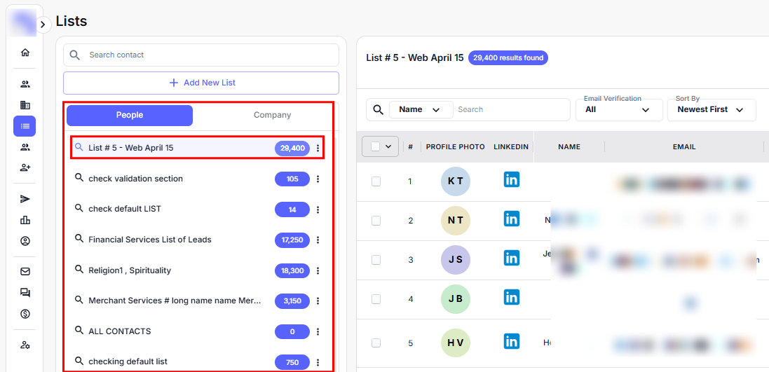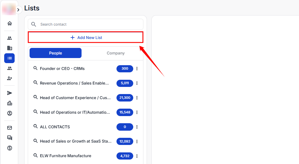 The add new list feature allows you to easily create a new contact list. You can choose to add a list of people or companies and either upload a CSV file or use the Lead Finder to search for and add leads directly. Once the list is created, it will be displayed in the Lists section, showing the total number of leads.