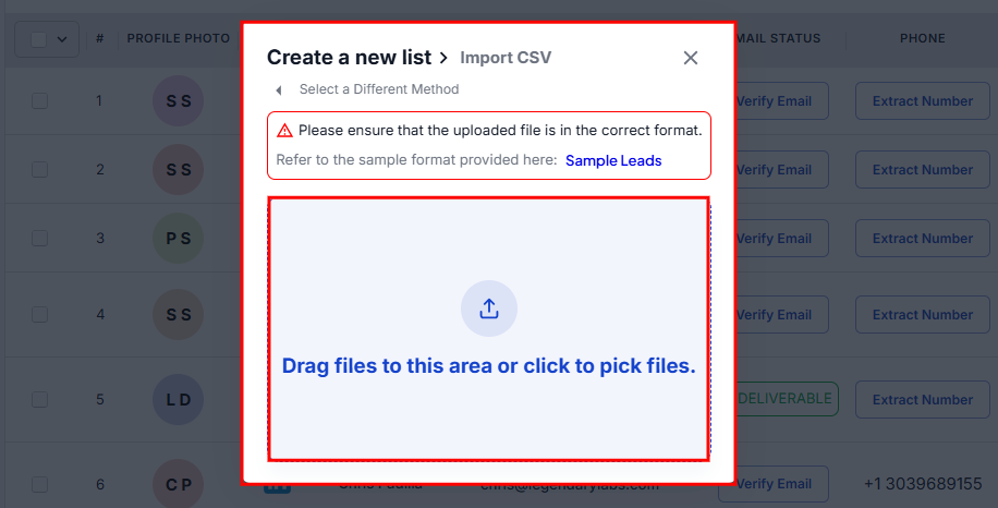 Step 6: After selecting the Import CSV method, upload a CSV file. Make sure it follows the correct format, then drag and drop or click on the pick files.
