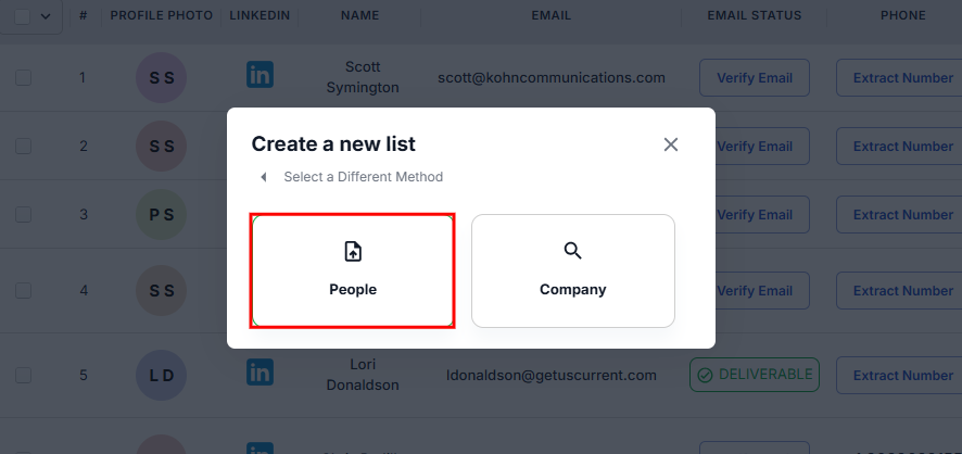 Step 4: A pop-up window will appear, prompting you to choose between People or Company for the type of list you want to create.