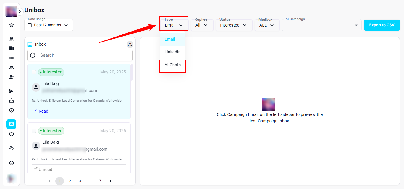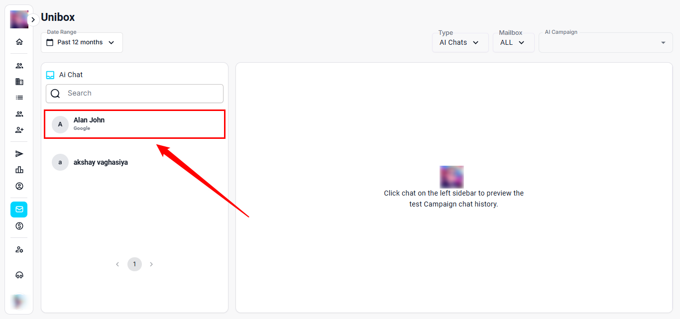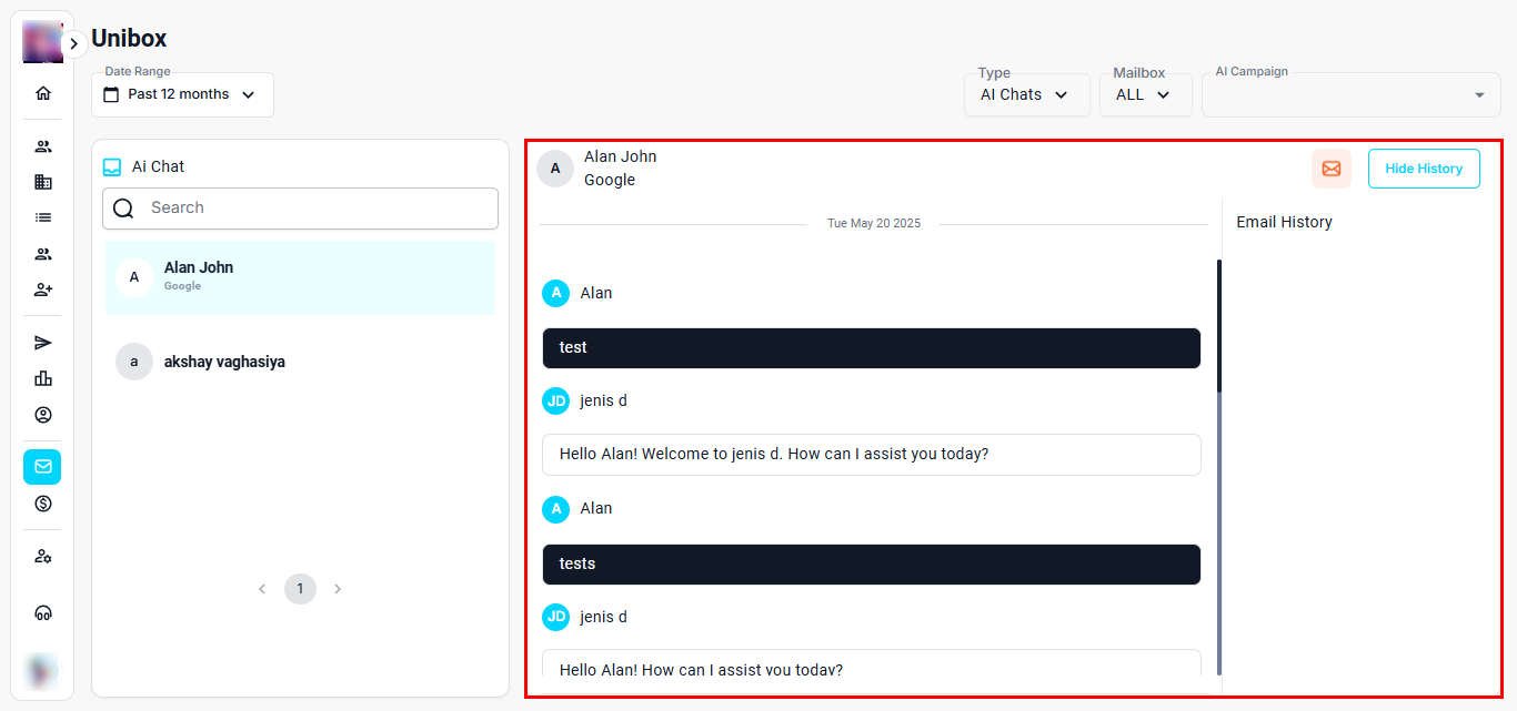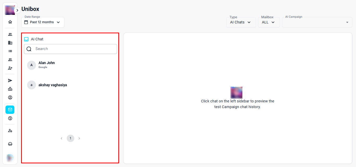 The AI Chats section helps you view and manage conversations handled by your AI assistant across all connected contacts and campaigns. It automatically logs chat interactions and makes it easy to review, follow up, or take action—right from your Unibox dashboard.