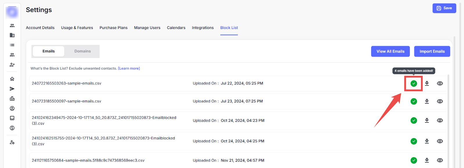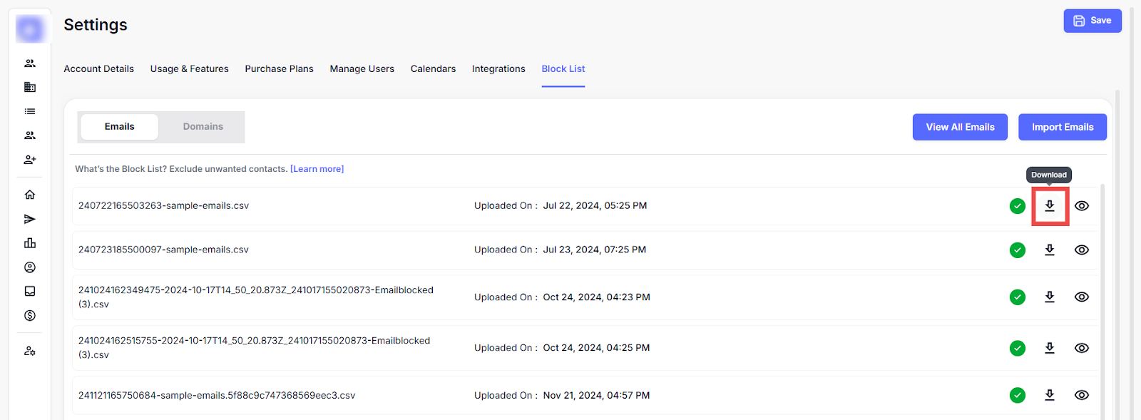 This page displays your current list of blocked emails and domains, with options to check added emails, download files, or view entries using the action icons.