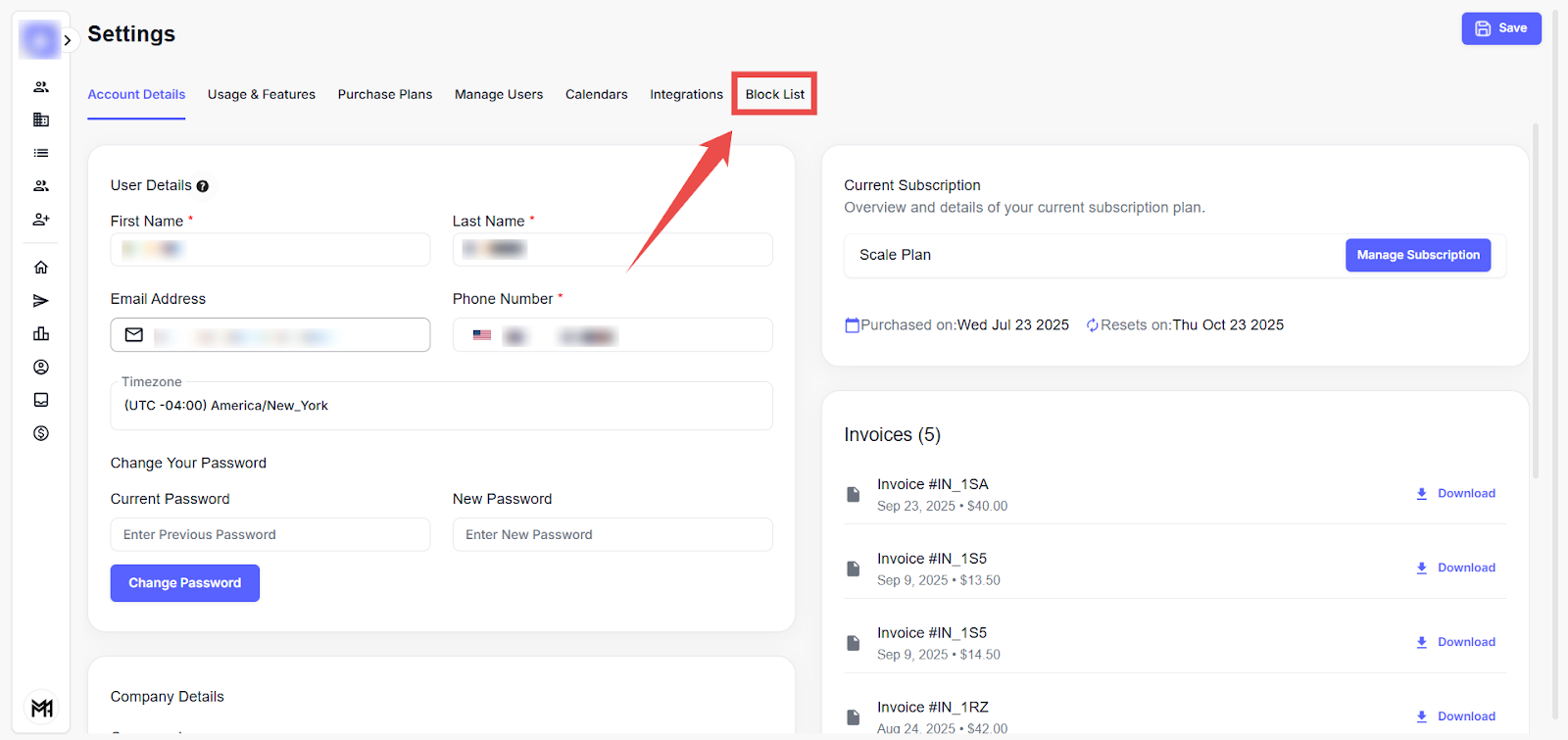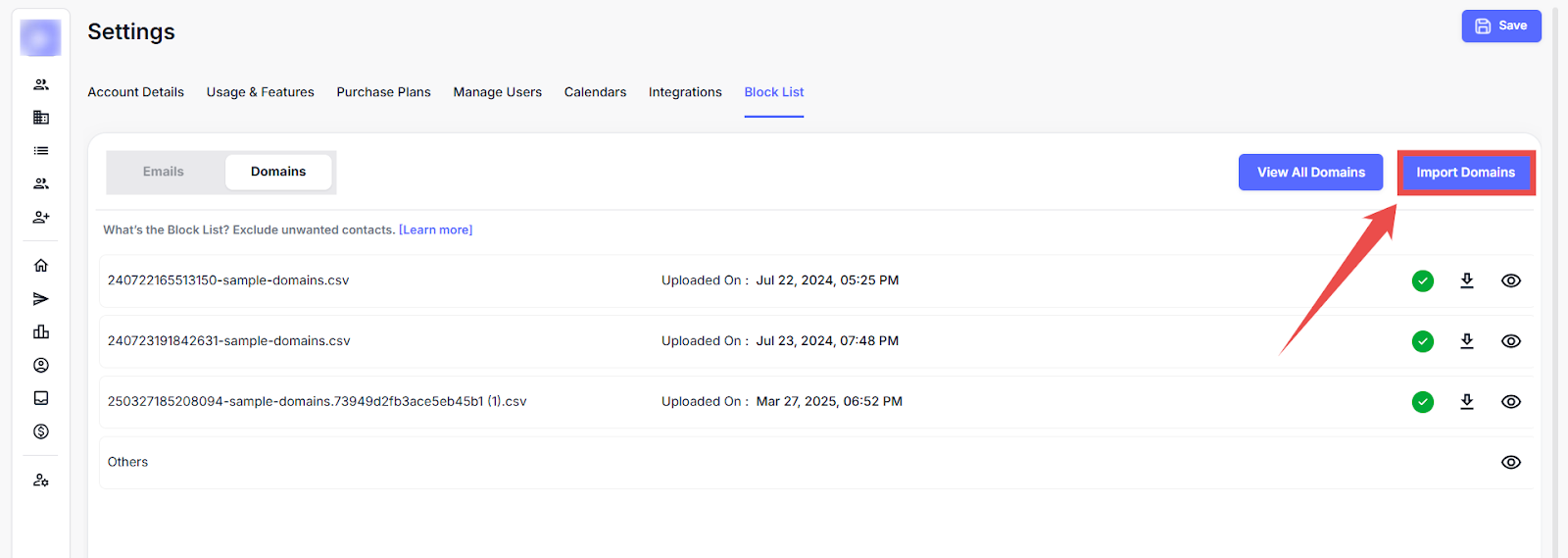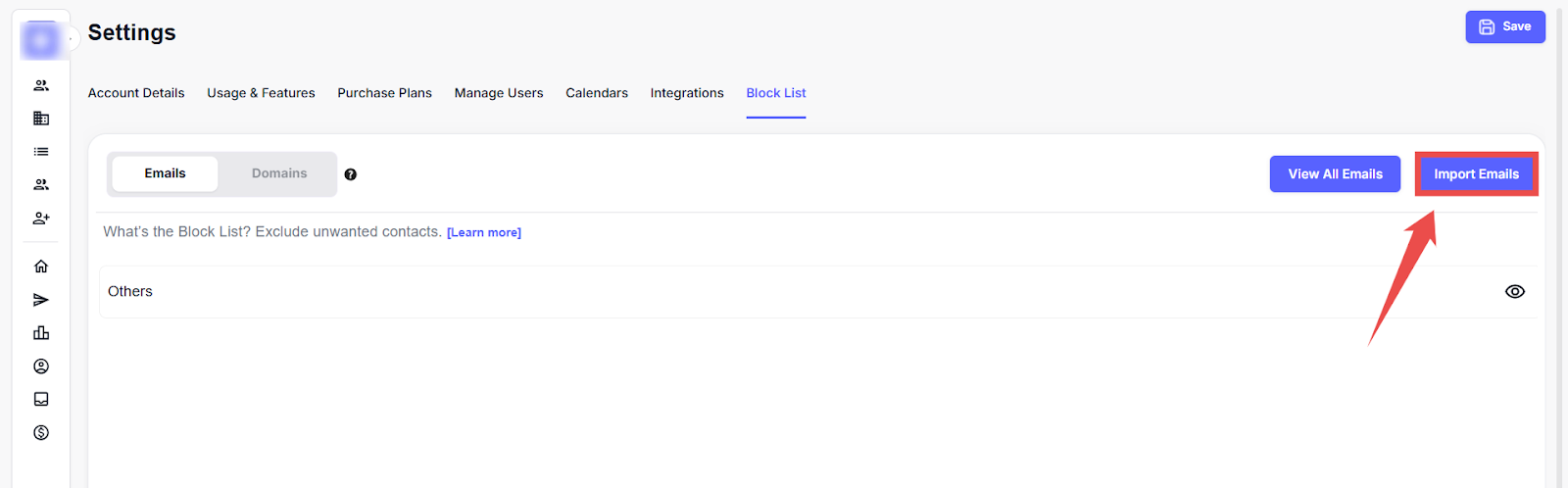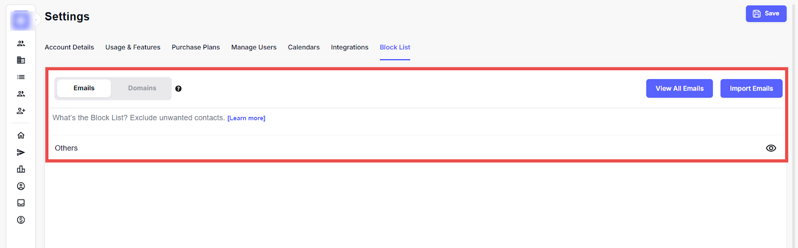 Use the Block List to prevent emails from being sent to unsubscribed contacts, invalid addresses, or restricted organizations. You can block individual email addresses or entire domains, depending on your outreach needs.