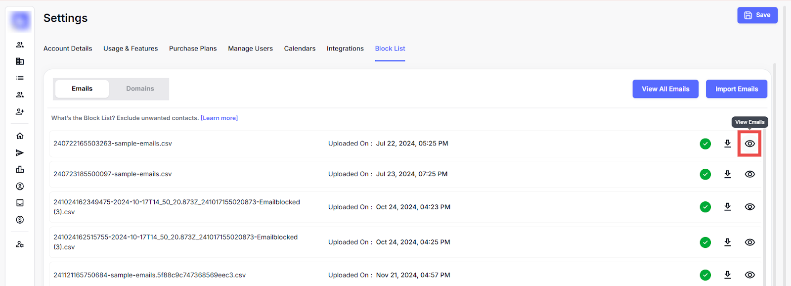 Step 3: Click the eye icon to view the list of blocked emails or domains from the file.