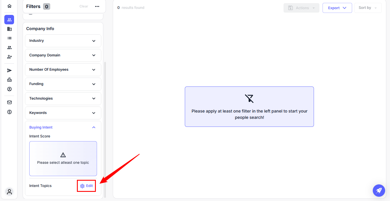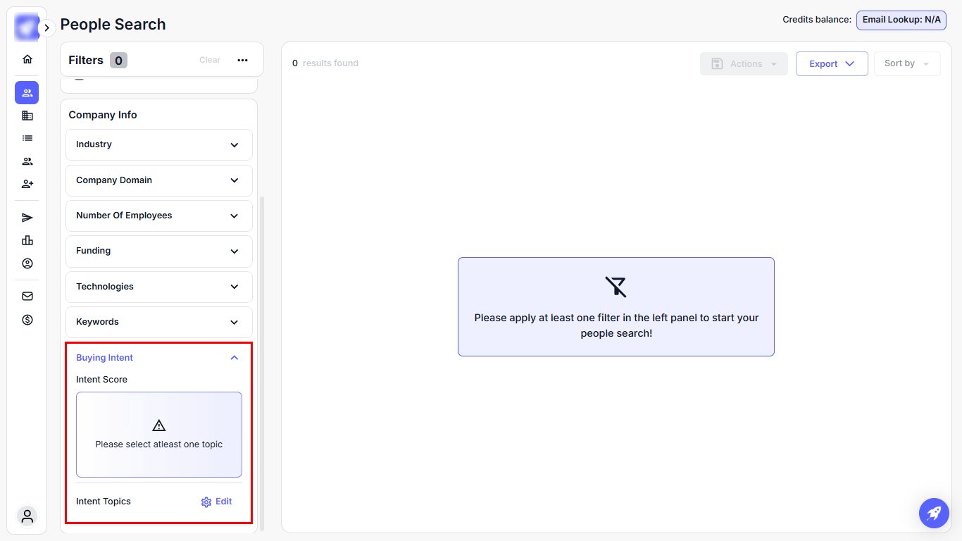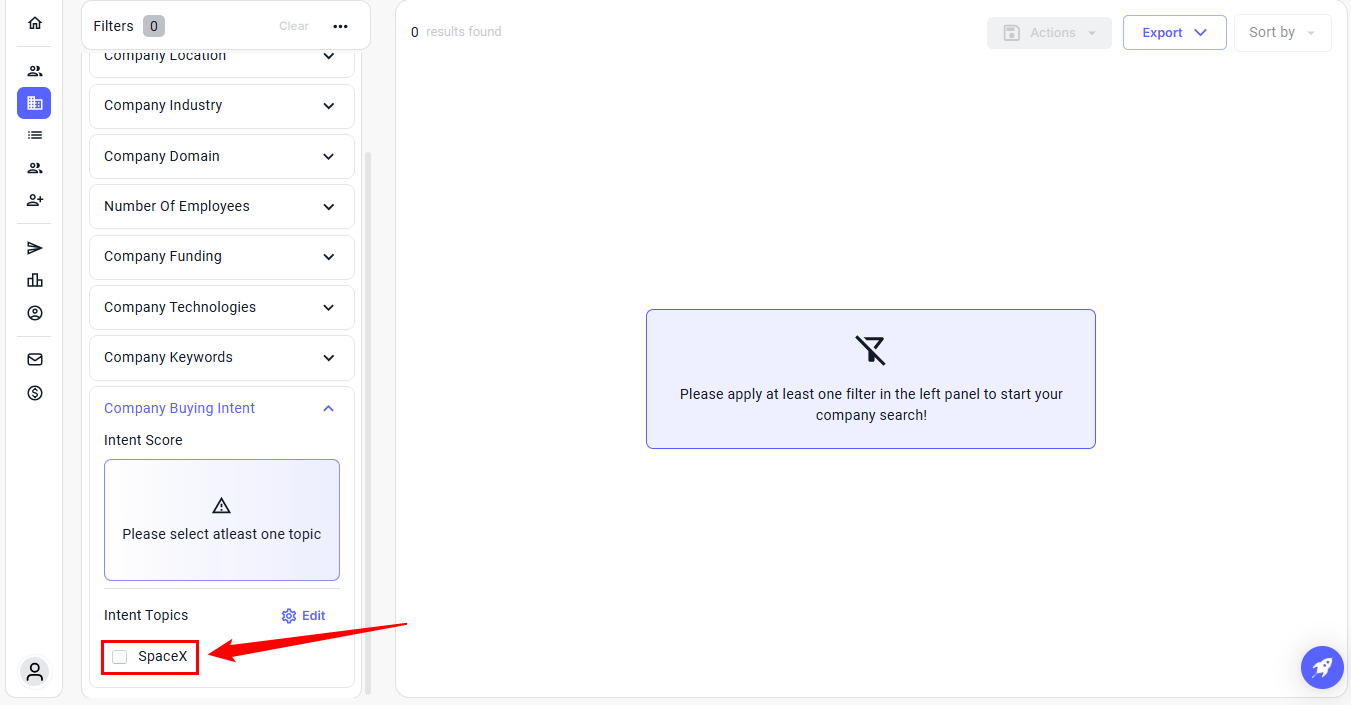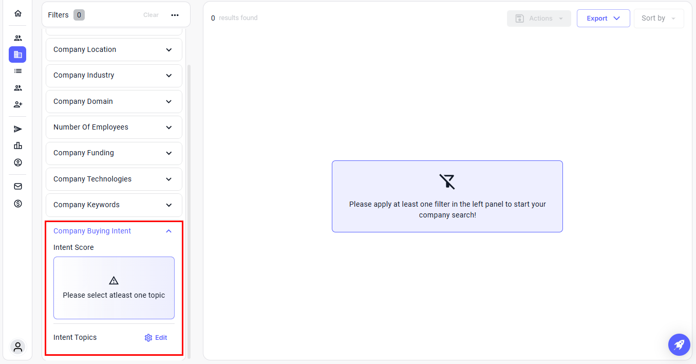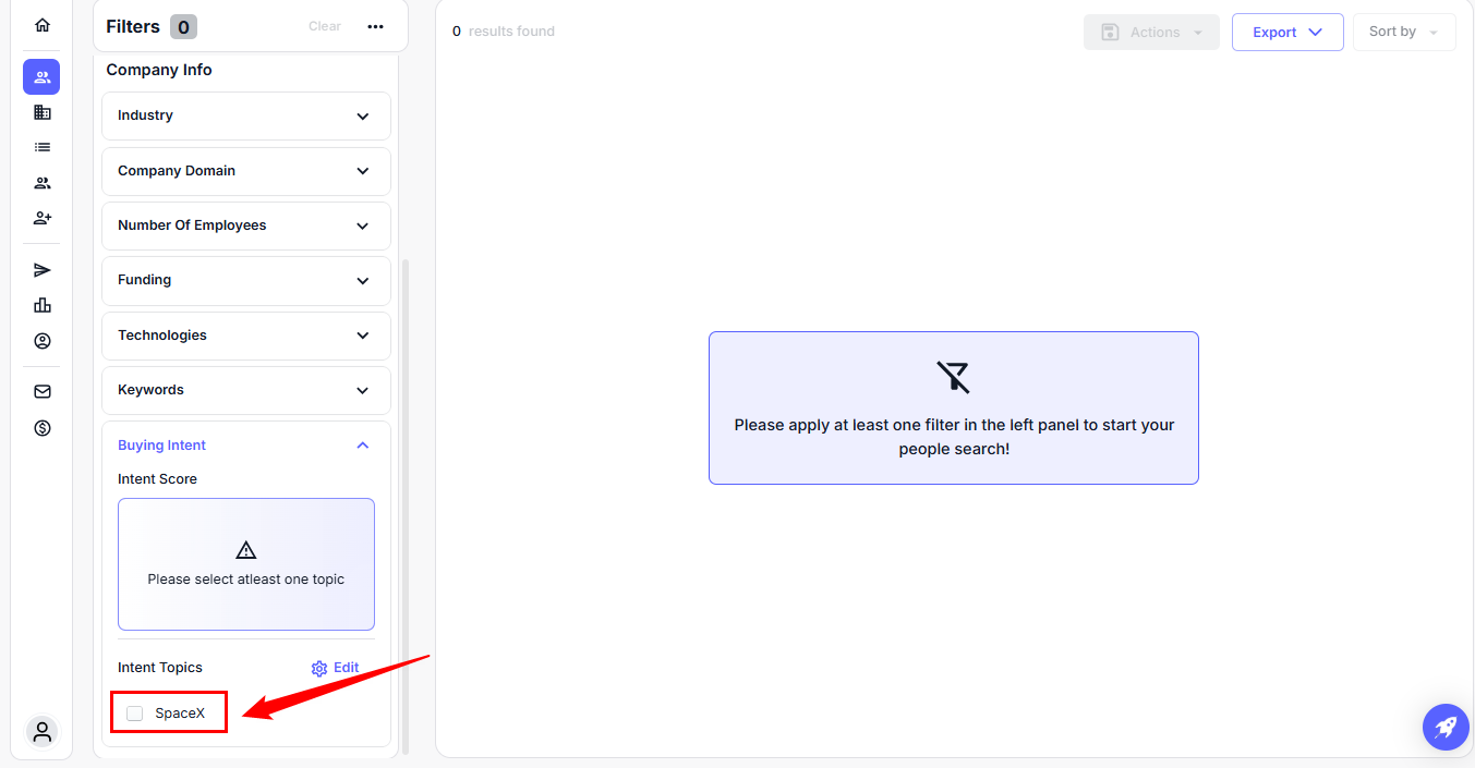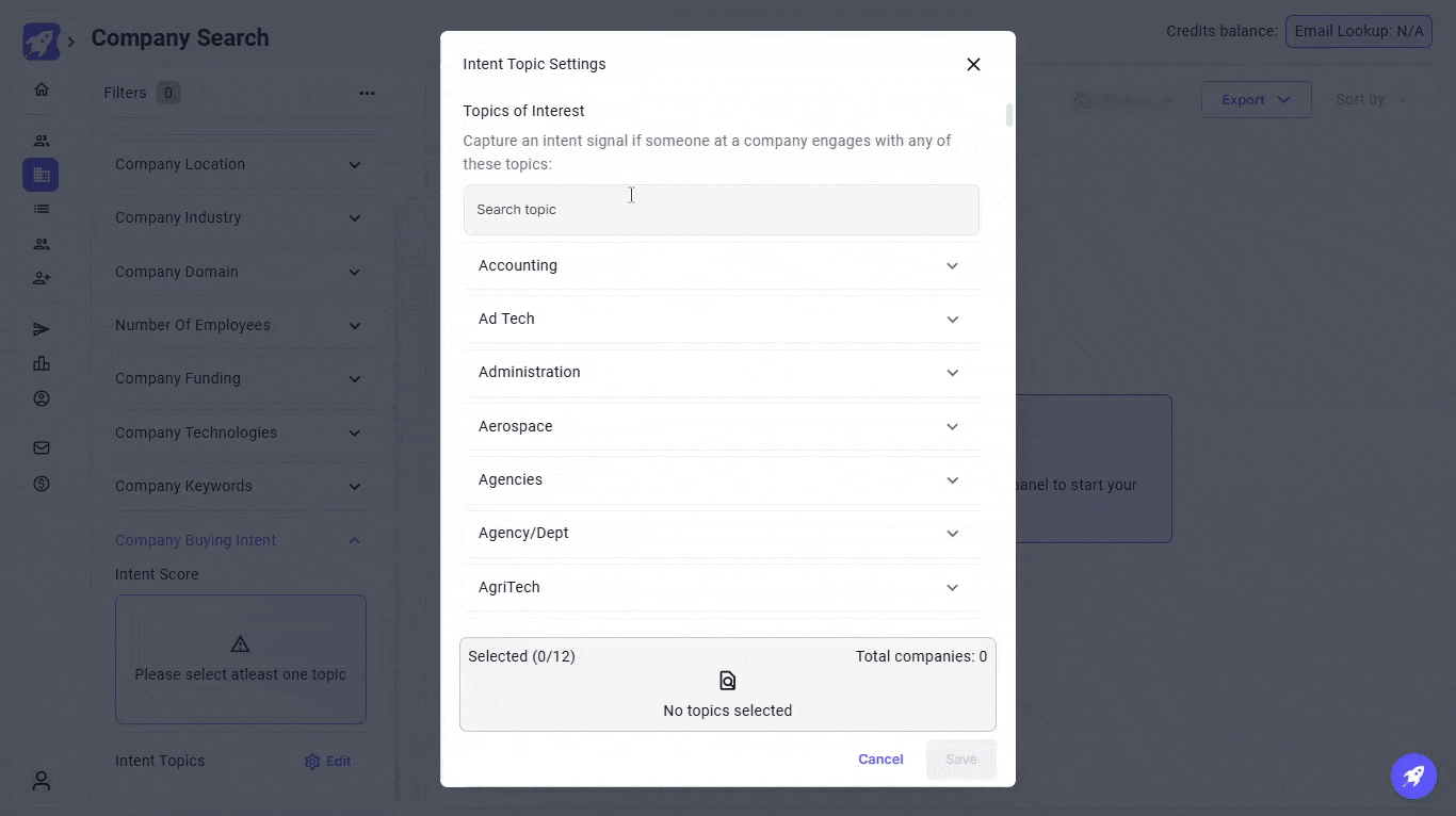 Step 3: Click on the Company Buying Intent filter from the left panel. A dropdown will appear saying "Please select at least one topic".