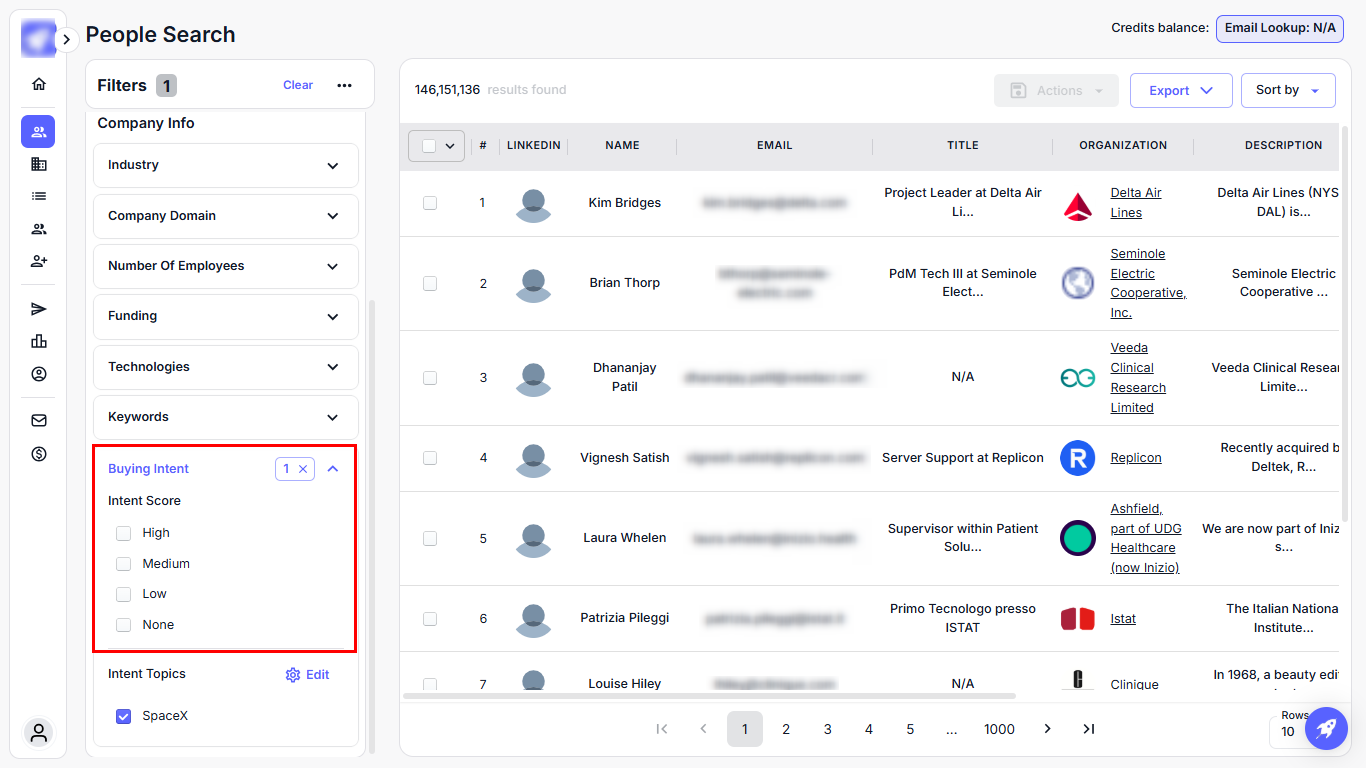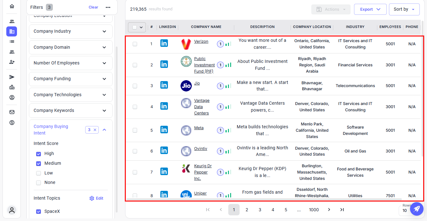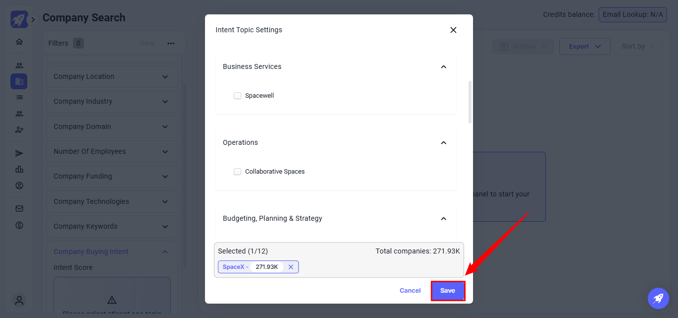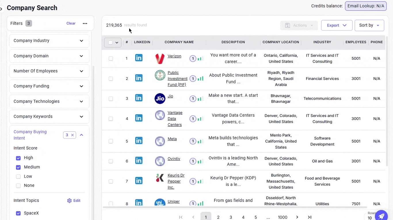 Use Buying Intent filters in Company Search to identify companies showing intent signals, so you can focus on organizations with strong buying interest.