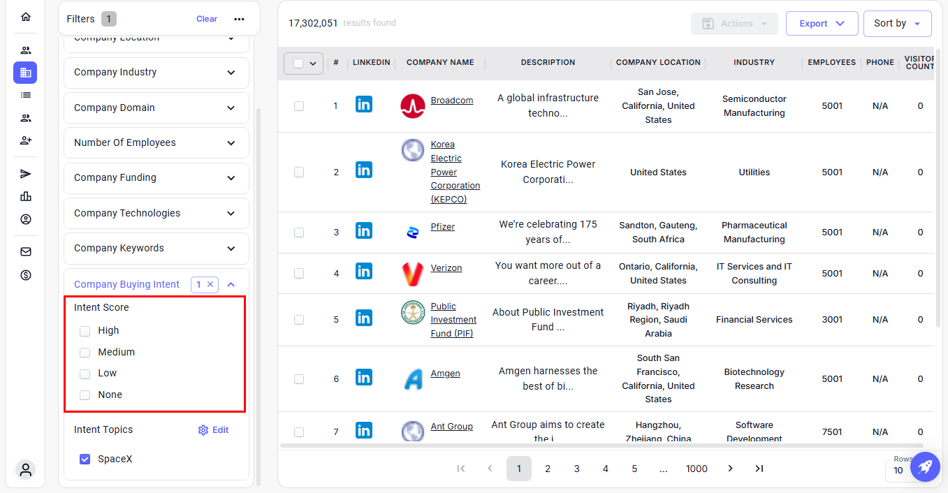 Step 7: Select the desired Intent Score. (High, Medium, Low, or None) to filter companies based on their level of interest.