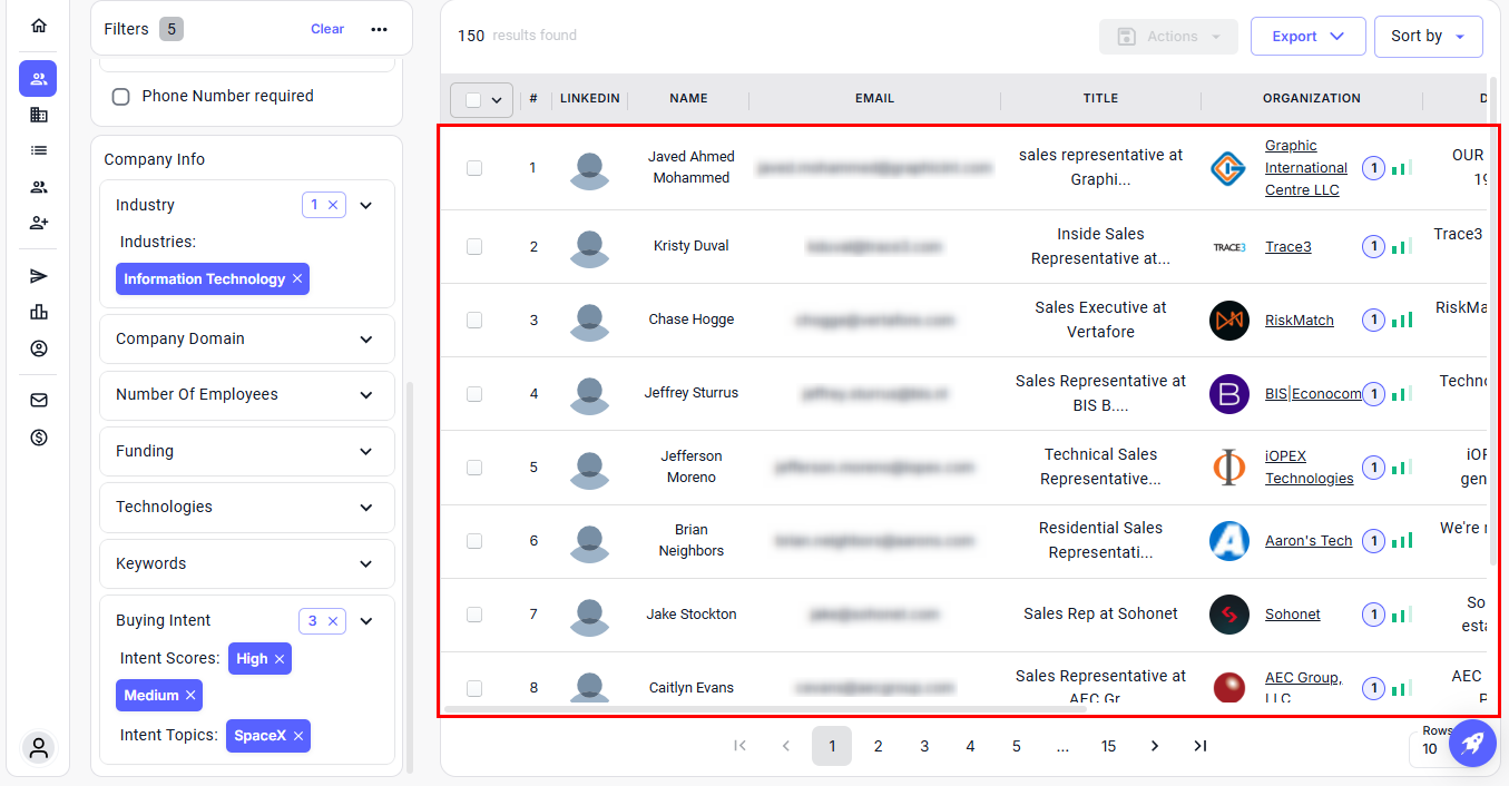 Step 8: Once the filters are applied, you will see a list of individuals on the right side, showing details like their company name, location, industry type, and employees hired.