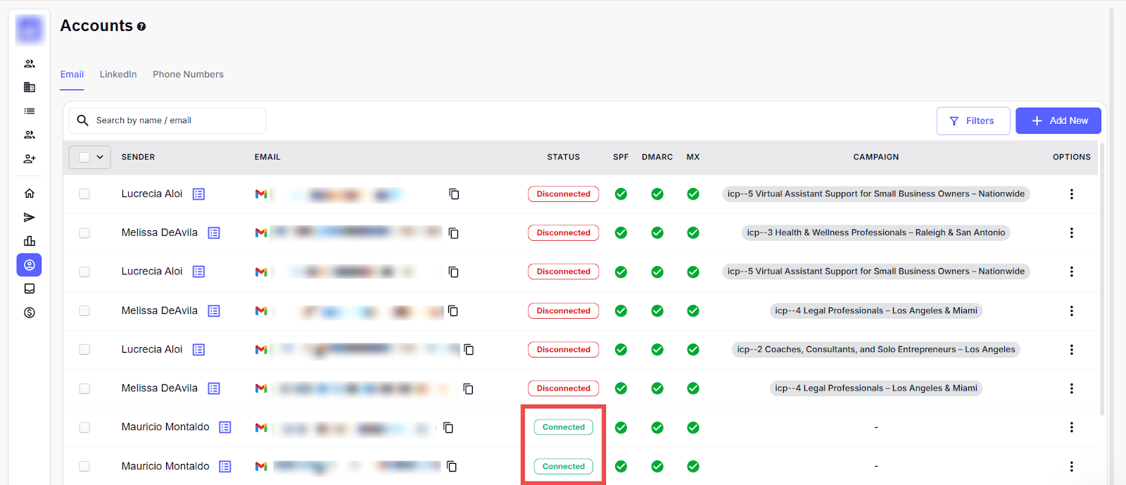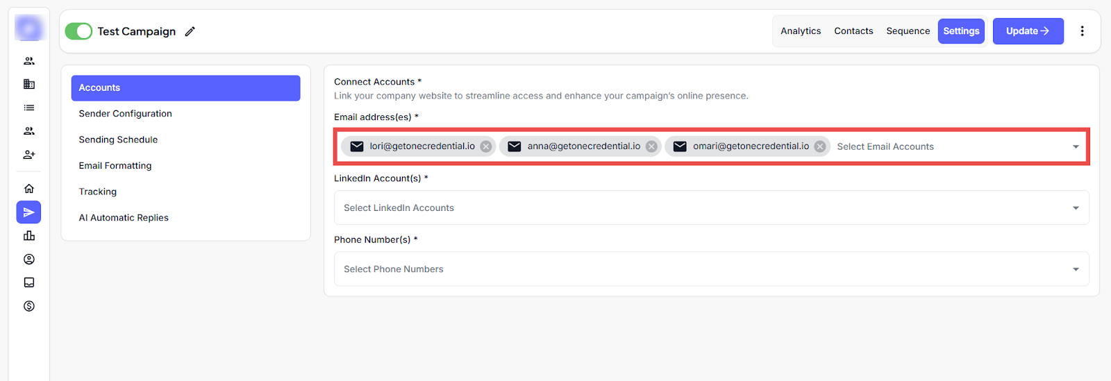 Shows and adds the accounts (Email, LinkedIn) connected to the campaigns. |