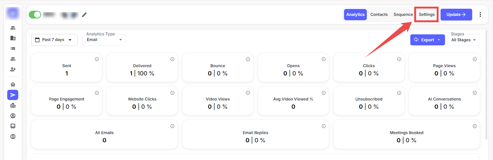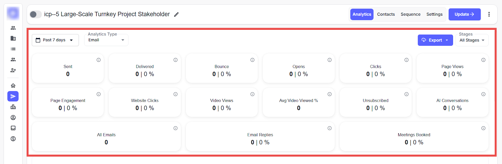 View real-time campaign performance across key metrics such as emails sent, delivered, and more. Use the filters at the top to adjust the date range, choose an analytics type, or narrow results by lead stage. For more information, refer to this document.