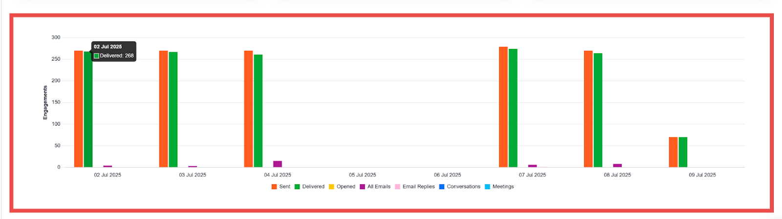 The graph offers a visual breakdown of your campaign’s outreach activity over time, with color-coded bars representing different metrics such as emails sent, opened, or clicked.