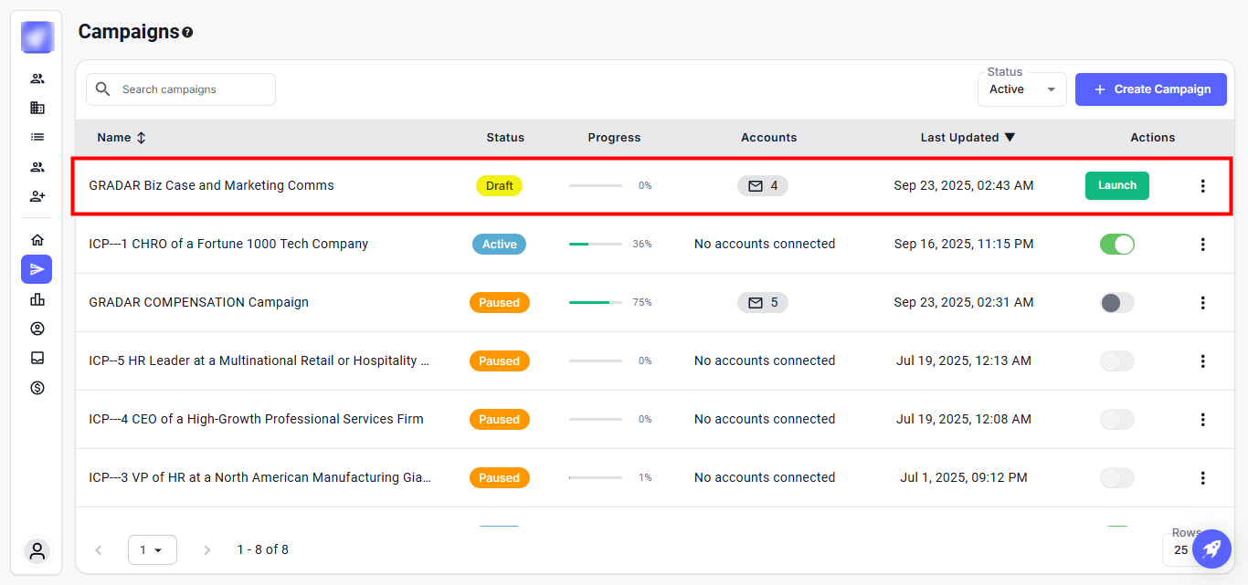 Step 4: Go back to the Campaigns page and launch it. This will update your campaign and should display as Active and Healthy, with email activity visible.
