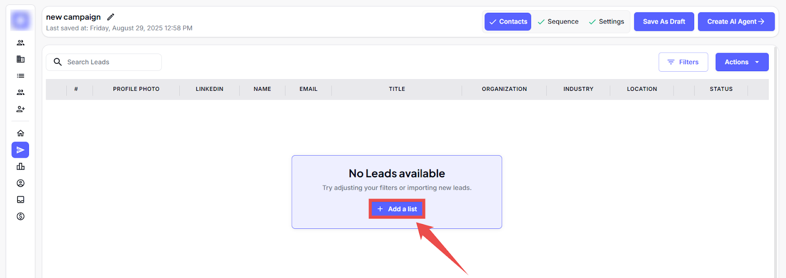 Click Add Leads to begin adding contacts to your campaign.