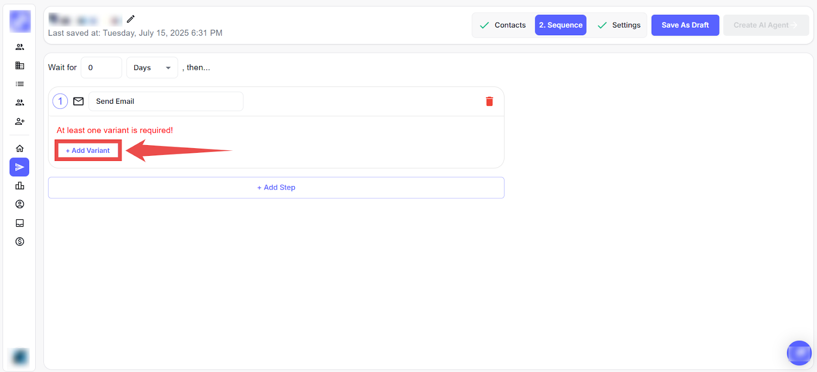Click on the + Add Step button to add a new cold email to your campaign sequence.
