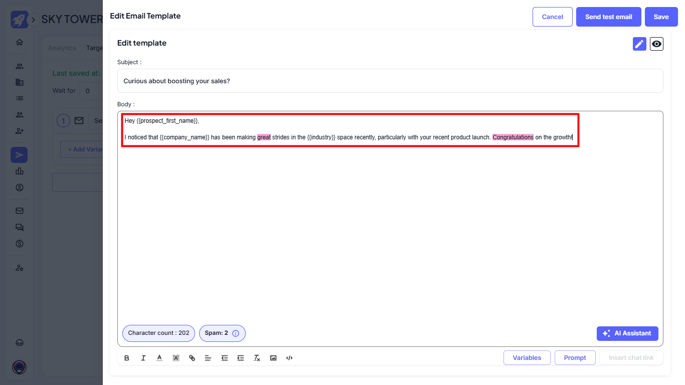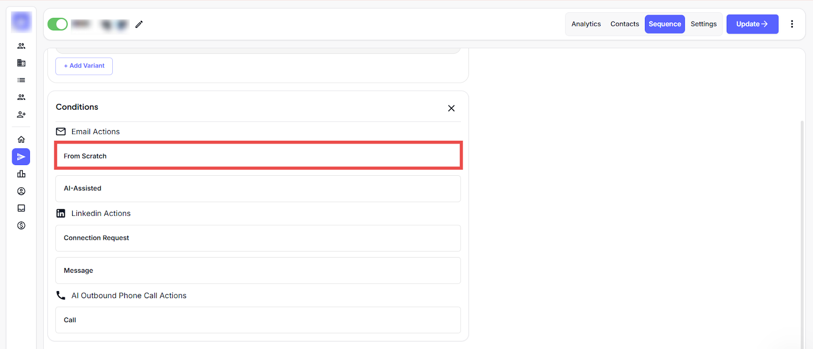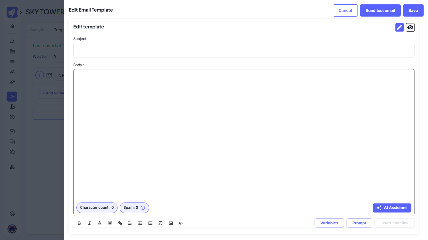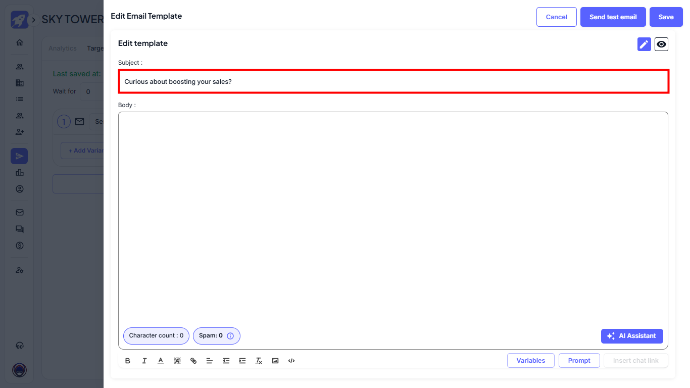 Click on the + Add variant button to open the email editor, where you can begin writing or generating your cold email.