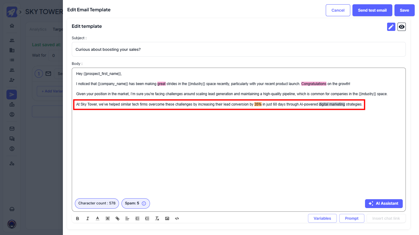 Follow this proven structure when writing or prompting inside the Email Editor. This helps you create cold emails that drive more replies by combining personalization, AI prompt tags, and strong messaging using: