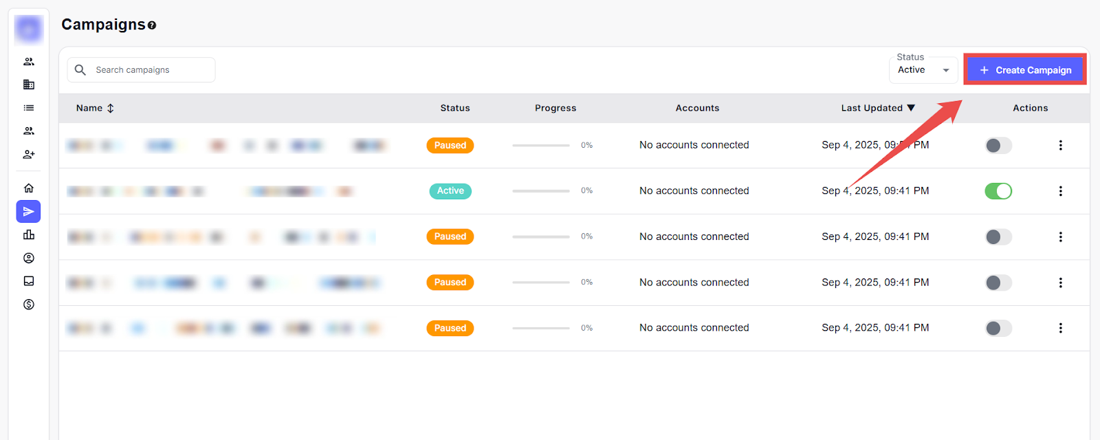 Once you have navigated to the Campaigns dashboard, click the + Create Campaign button.