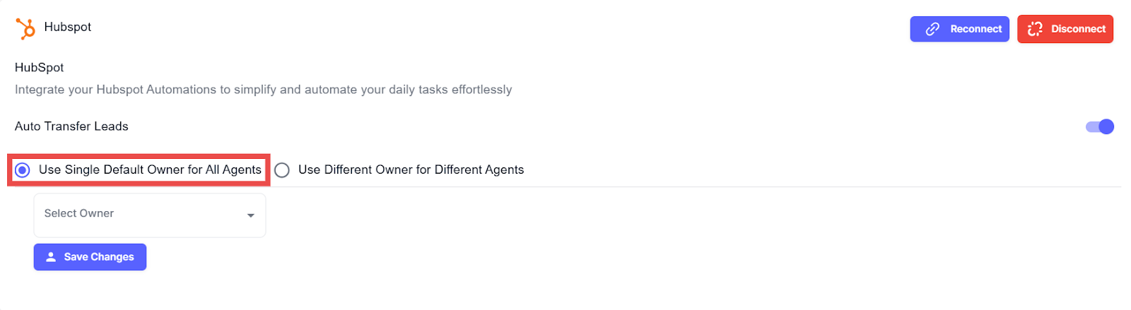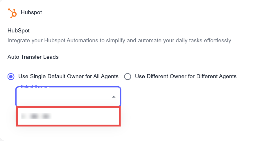 Step 2: Select the Use Single Default Owner for All Agents option to ensure all leads are transferred to one HubSpot user.