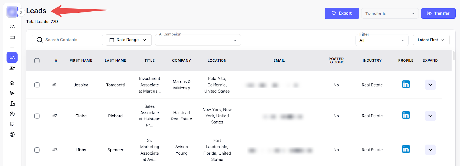 Step 3: Click on the Transfer To drop-down menu at the top right corner to view various lead transfer options.