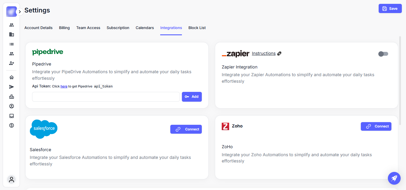 The Salesforce integration allows you to connect your Salesforce CRM account to automate the flow of leads from your outbound campaigns. Once connected, leads generated through tools like Lead Finder or email sequences can be directly synced to your Salesforce CRM in real-time.