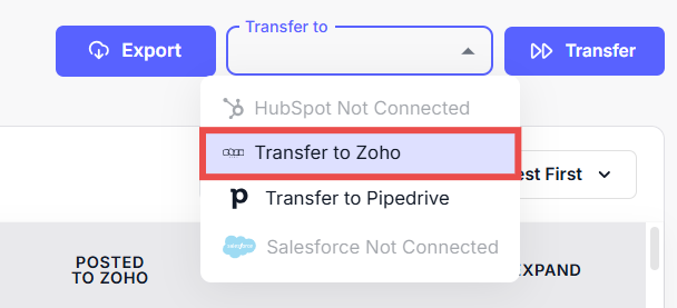 Step 5: Click on the Transfer button to transfer your lead to Zoho.
