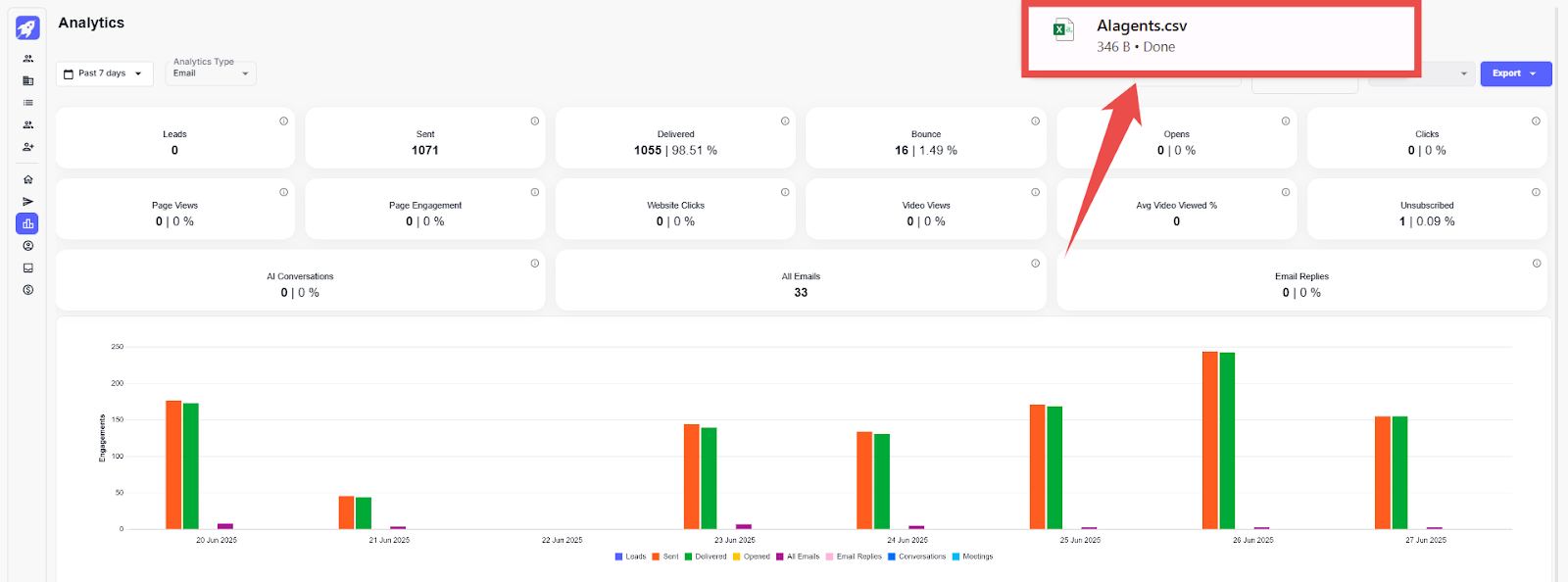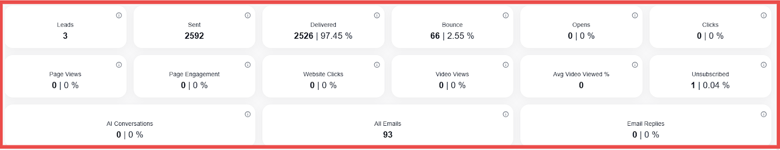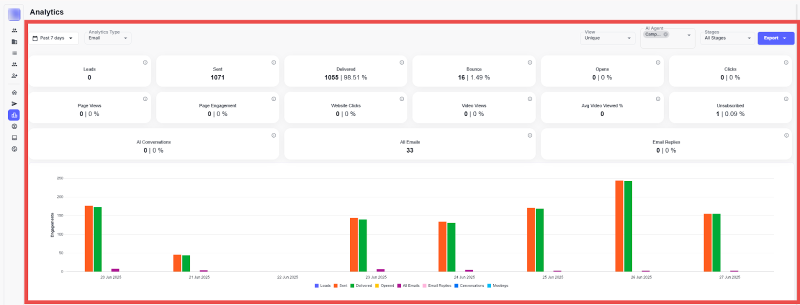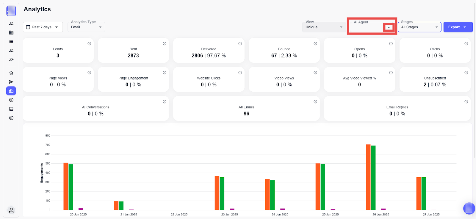Here you can view the performance metrics and engagement data specific to the selected AI agent, helping you assess its effectiveness in your outreach campaigns.