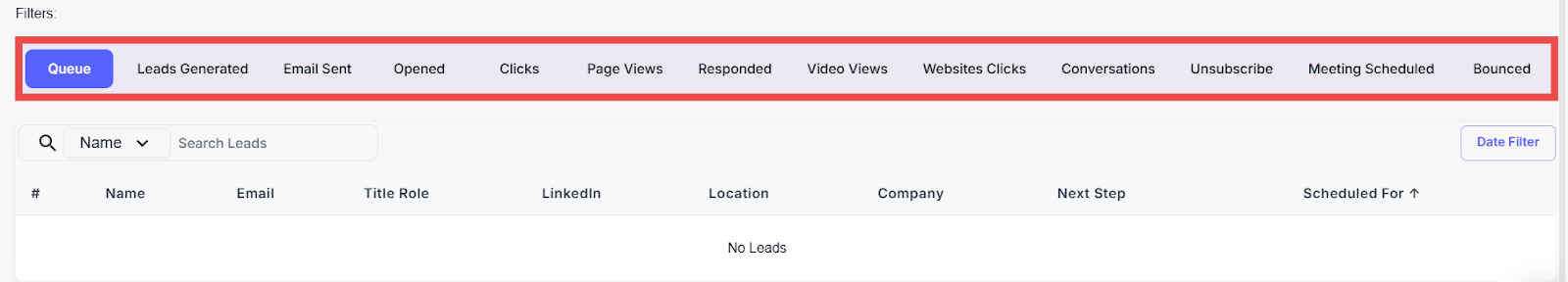 These tabs allow you to quickly segment and analyse your leads based on their activity and engagement level: