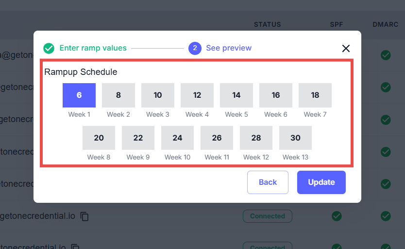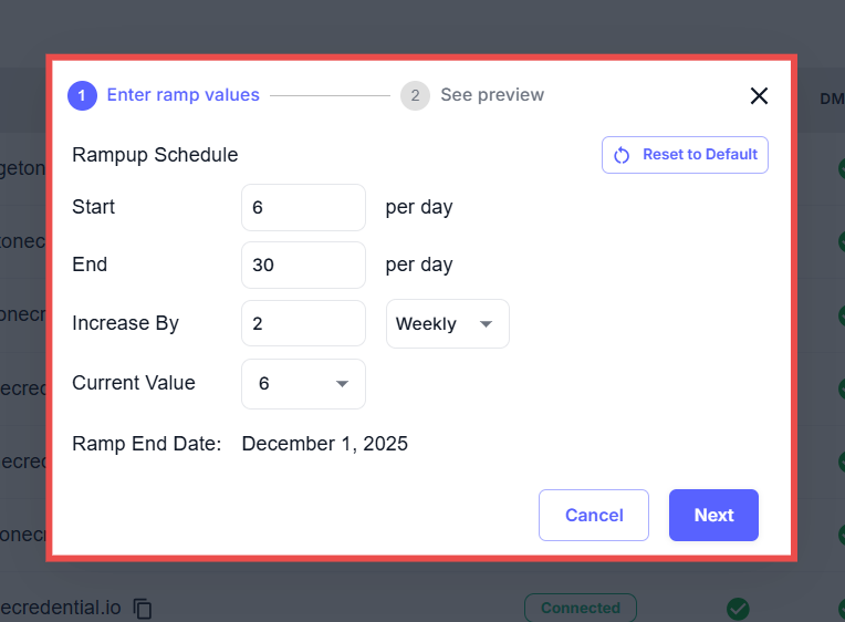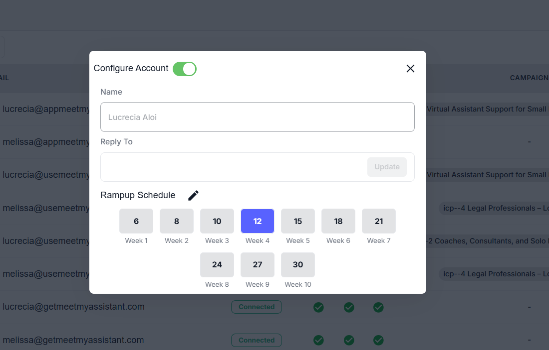 You can customize your ramp-up schedule to control how your email volume increases while keeping your domain safe. This feature lets you adjust the weekly sending limits to suit your business needs, ensuring steady growth in your email outreach.