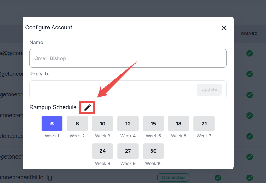Step 2: After clicking the edit icon, the ramp-up schedule will open in edit mode, where you can view and modify the weekly sending limits.