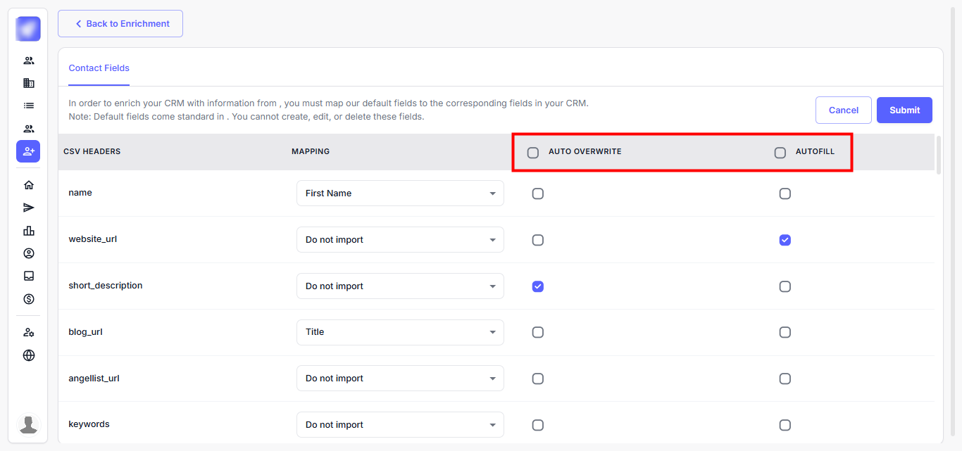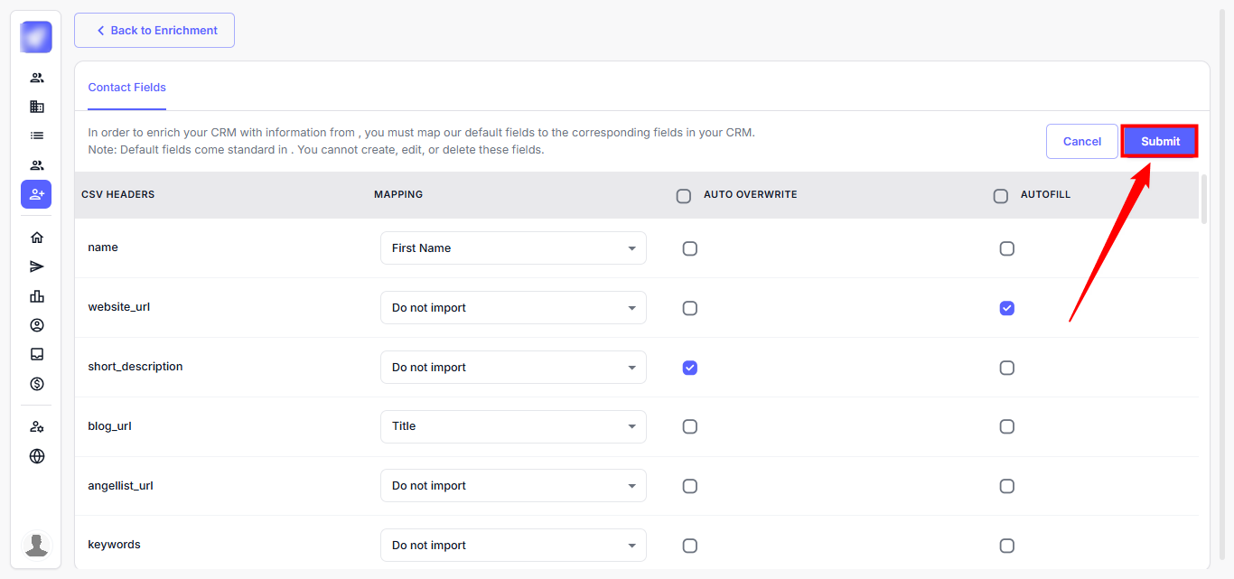 Step 4: After uploading, map your CSV headers to the enrichment fields: