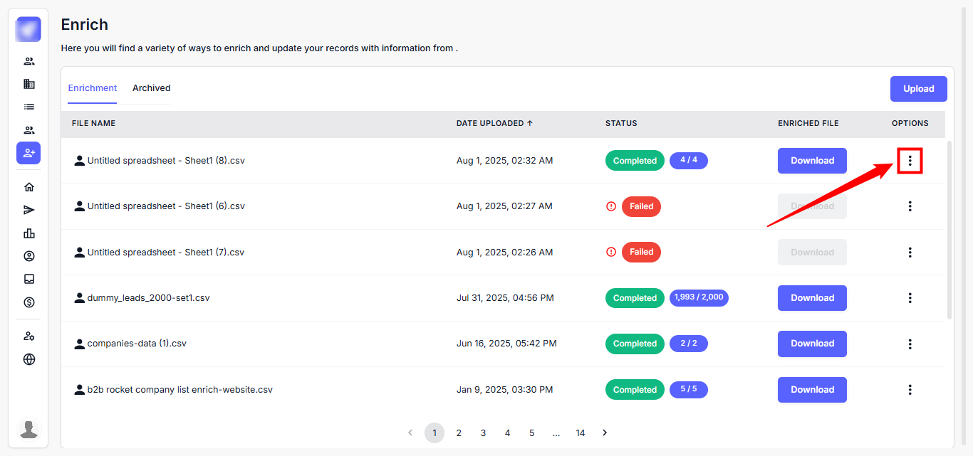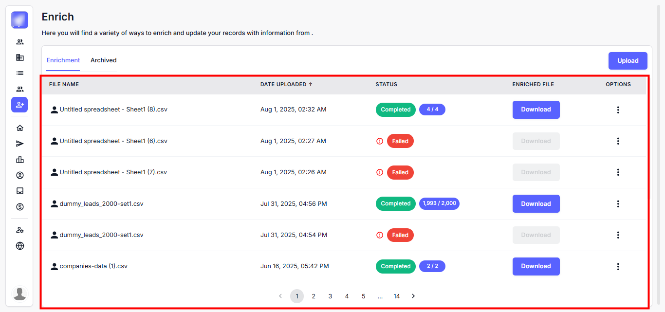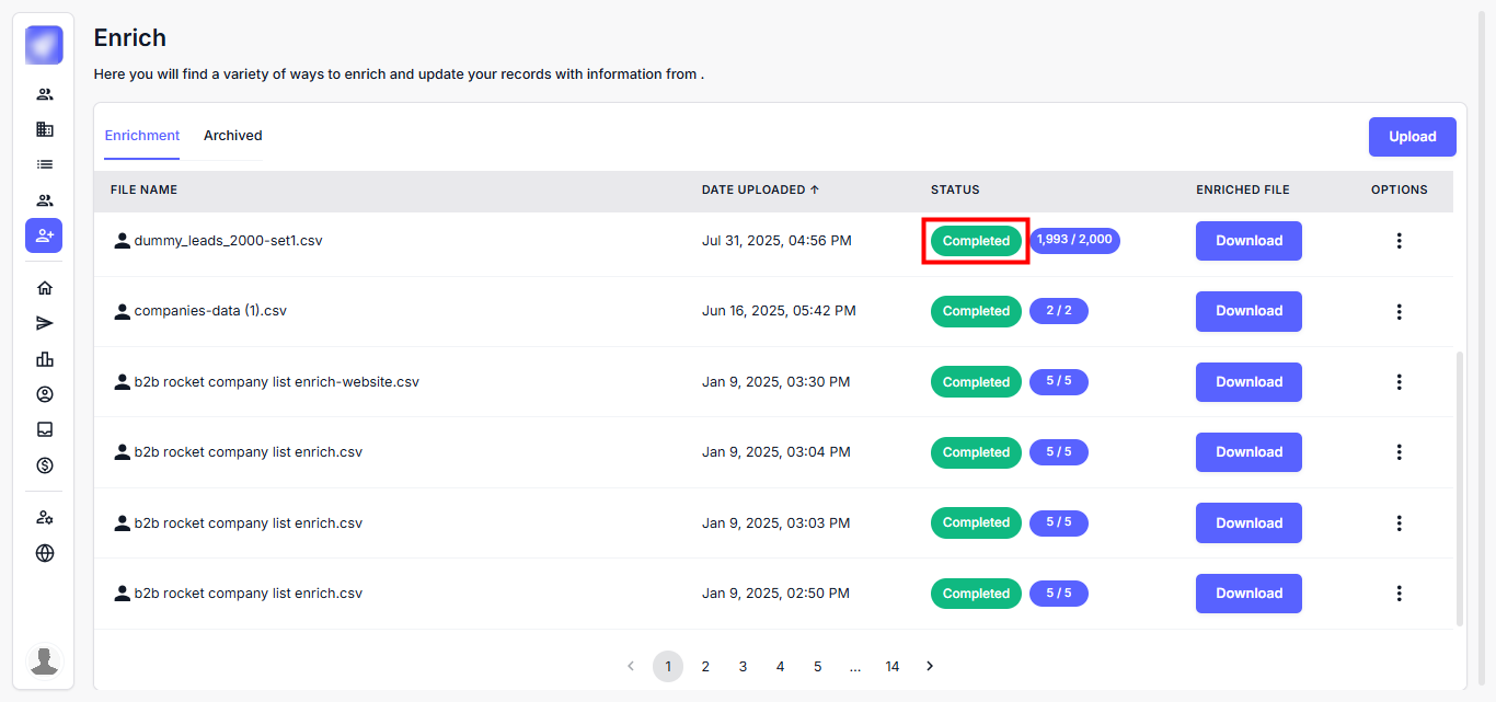 Step 2: You will land on the Enrichment dashboard, where you can view all uploaded files and their enrichment status.