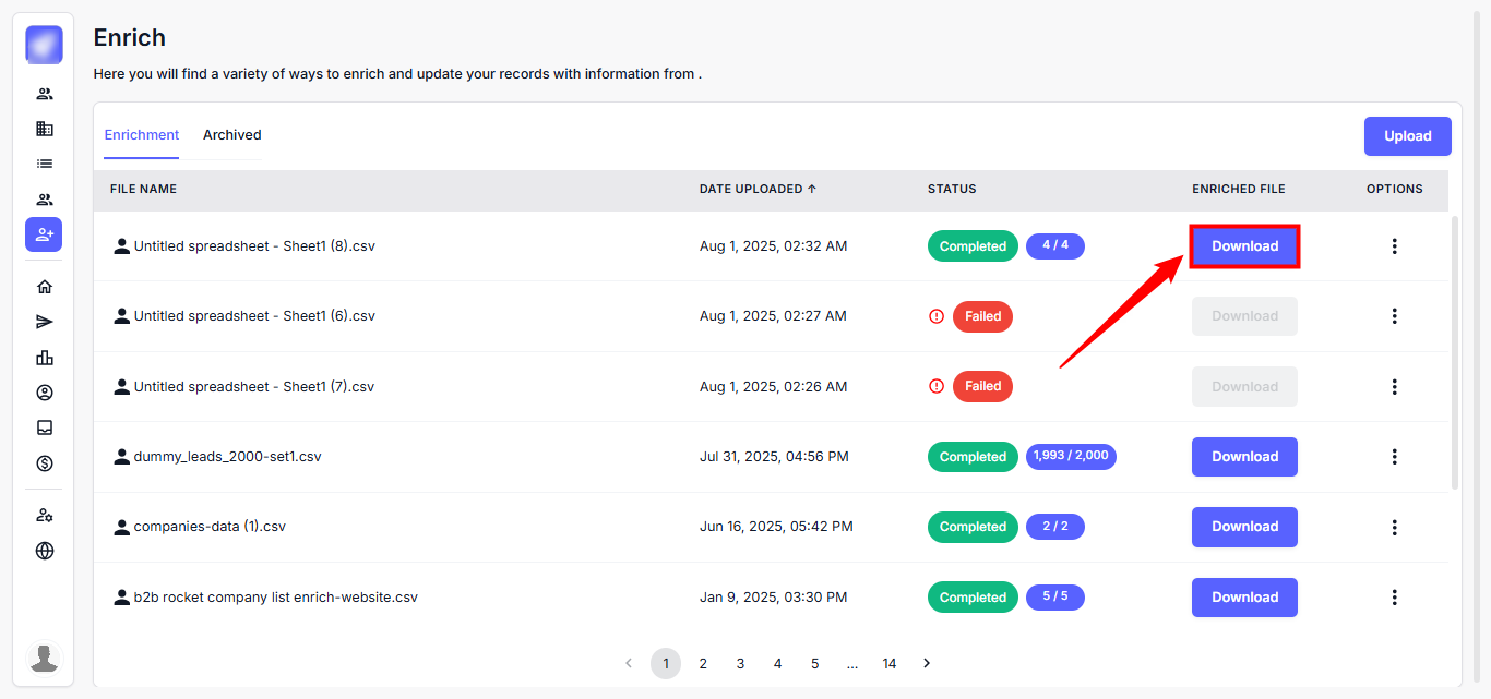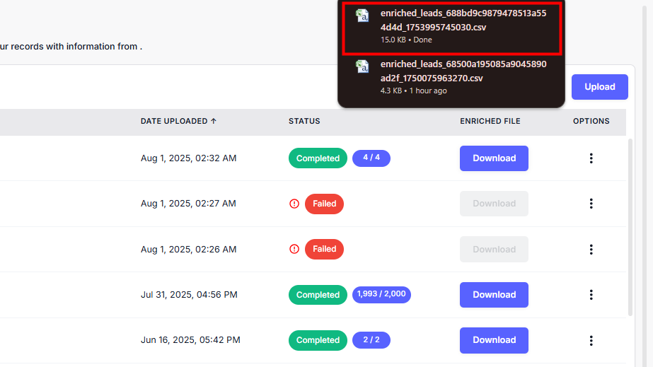 Step 1: Locate the file with the “Completed” status and click the Download button in the Enriched File column.