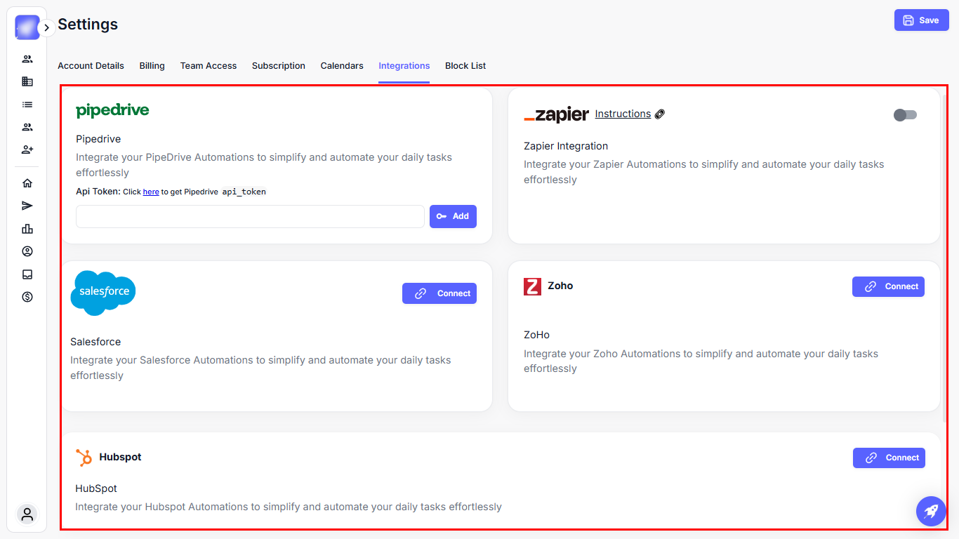 Whether you want to automatically push new leads from outreach campaigns into your CRM, assign ownership dynamically, or capture traffic insights from your website, everything starts with the Integrations panel.