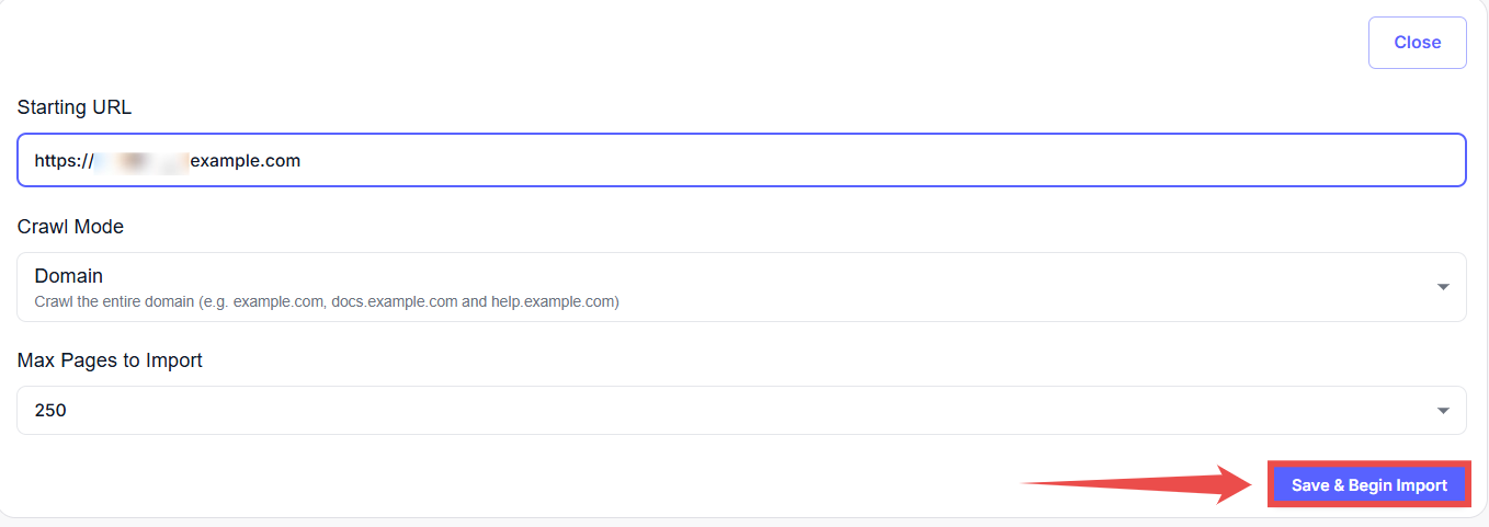 Choose how the system should crawl the site: - Domain: Crawls the entire domain, including subdomains like docs.example.com or help.example.com.