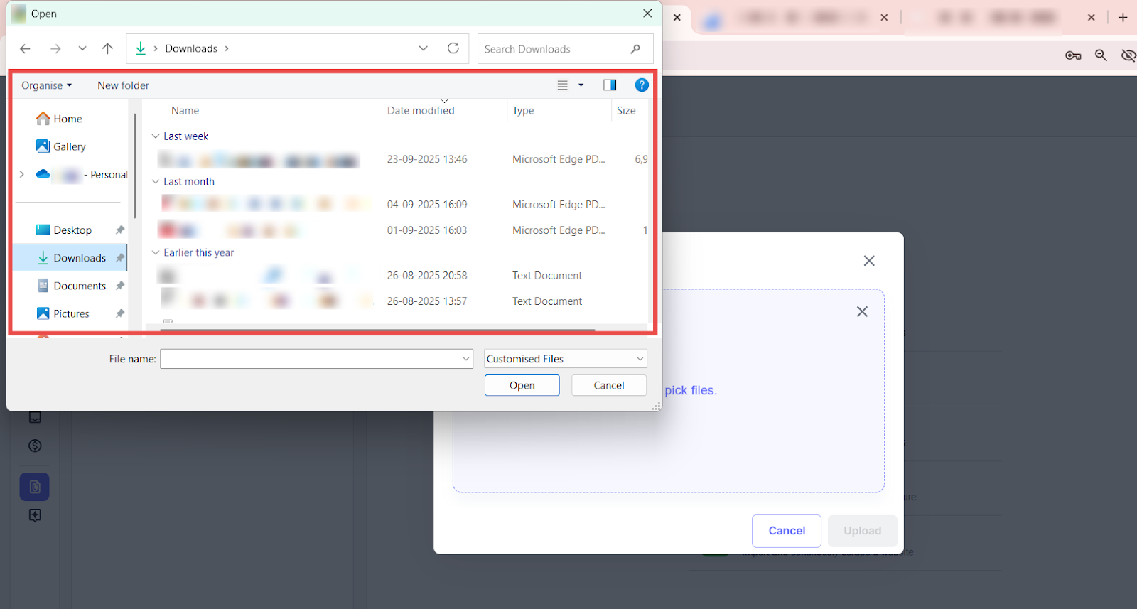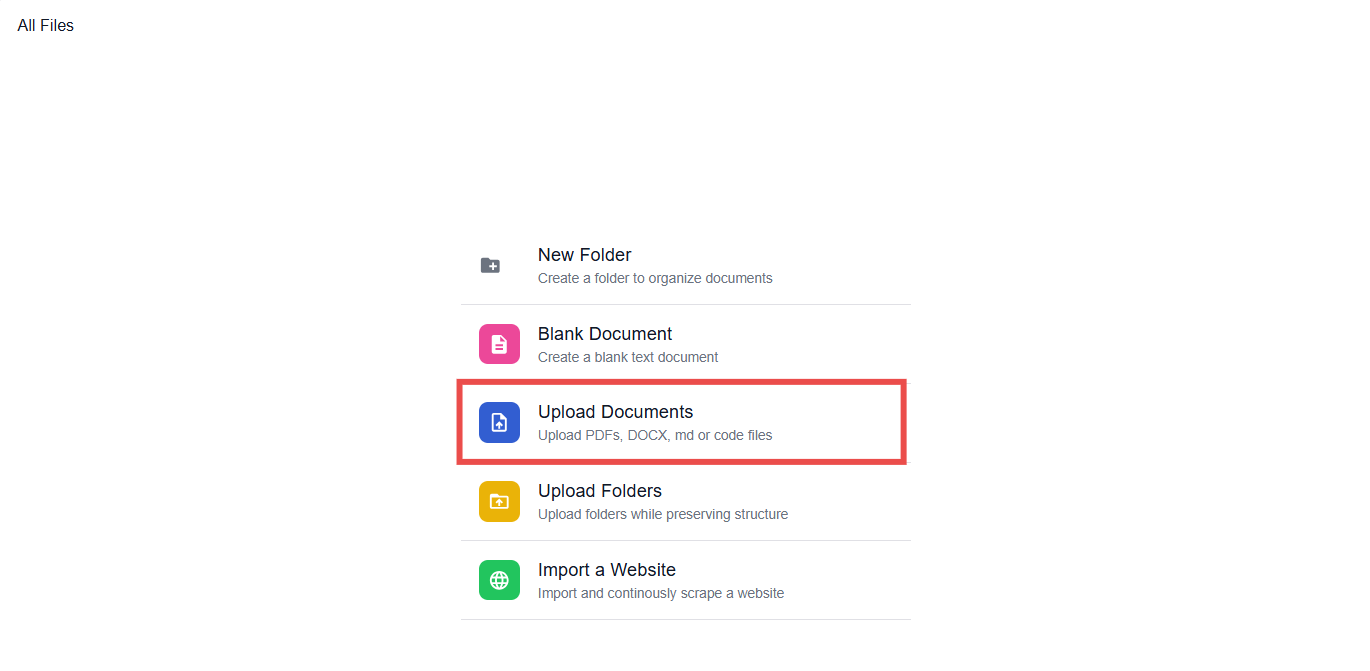 You can upload supported files such as PDFs, DOCX, Markdown files, or code files.
