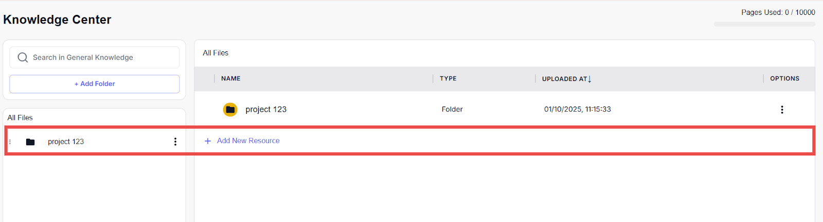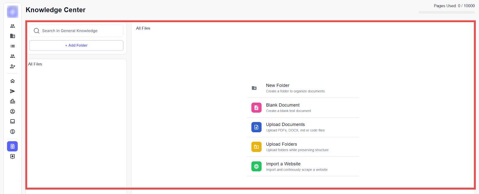 The Knowledge Center is a centralized space where you can organize, upload, and import resources. It enables agents and team members to easily access training materials, reference documents, and other key resources in one place. This ensures that your knowledge assets remain structured, searchable, and readily available for use.
