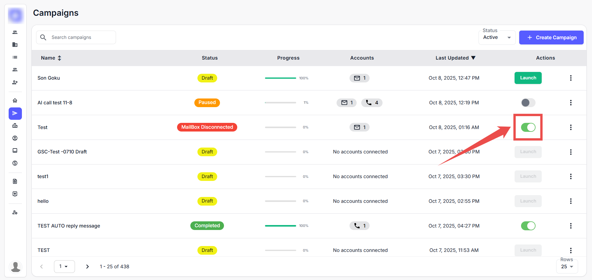 Once you’ve completed the mailbox assignment and reviewed the sequence, enable the toggle to launch the campaign. Emails will begin sending within the next 24 hours.