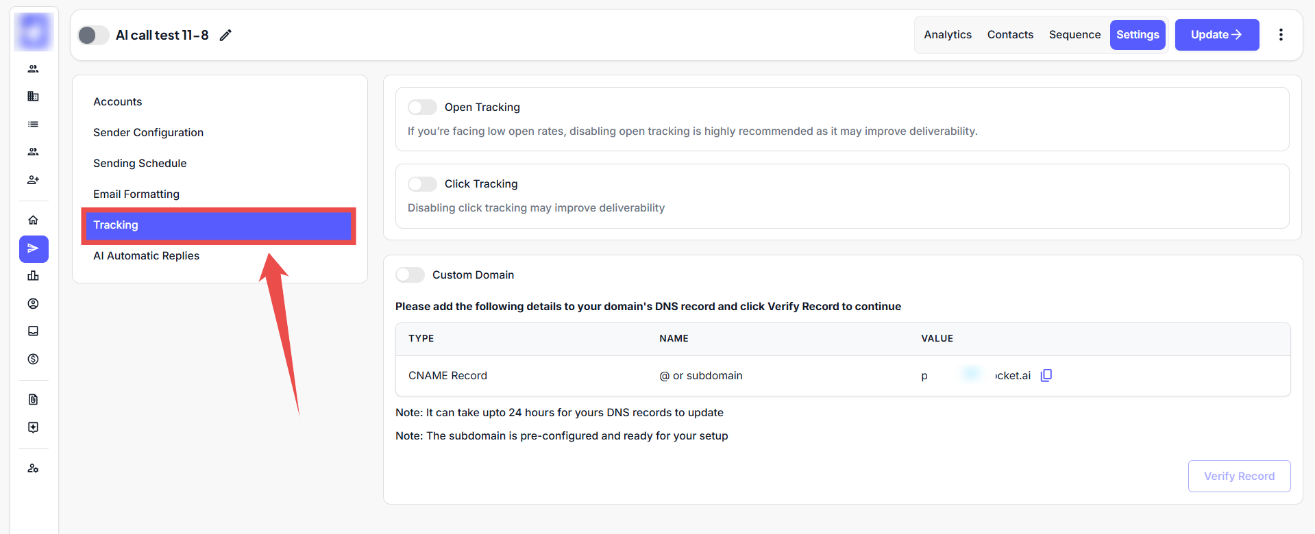 Uses your domain for tracking links, improving email deliverability, and branding consistency.