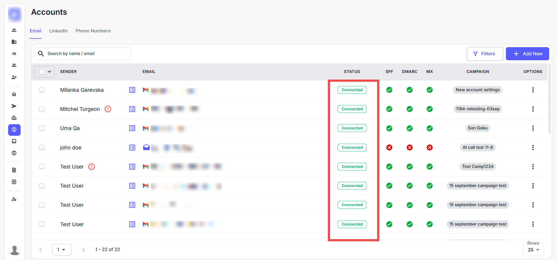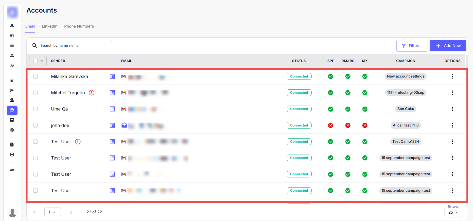 Note: If no mailboxes are visible in the Accounts tab, you may need to add an email account manually. If you’re using the DFY Domain and Mailbox Service, please wait for the warm-up process to complete—you’ll receive an email notification once your mailboxes are ready to use.