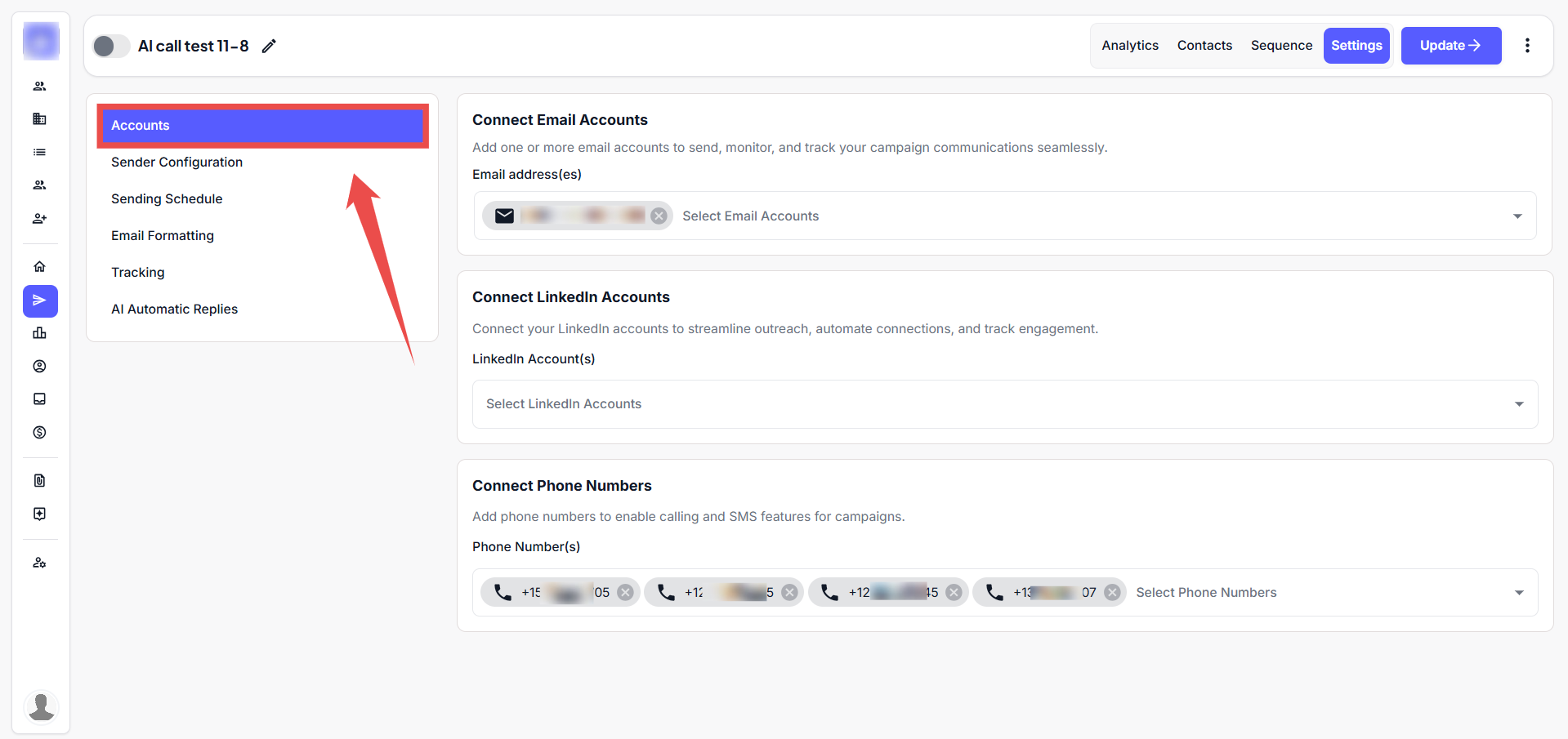 Allows you to connect and manage email and LinkedIn accounts, ensuring seamless access and integration for your campaigns.