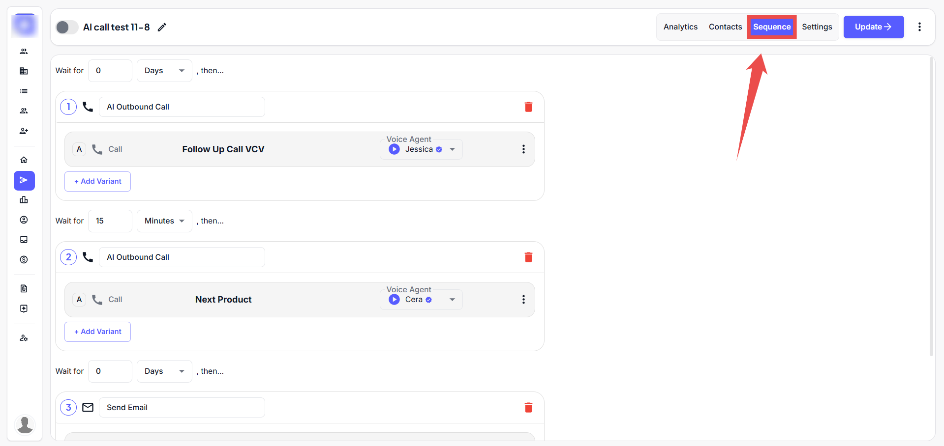 Step 2: After verifying the Contacts list, return to the Campaigns Dashboard and click on the Sequence tab to review the email sequence.