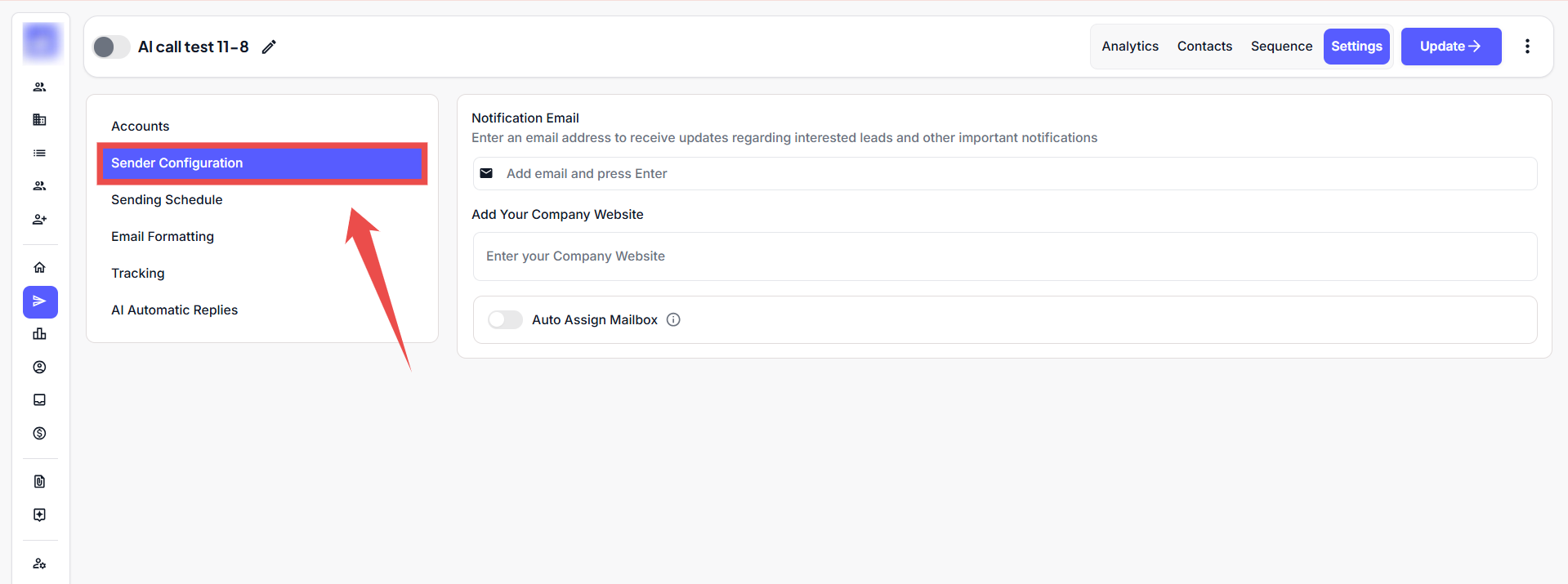 Defines the sender details, notification email, and mailbox assignment for the campaign.