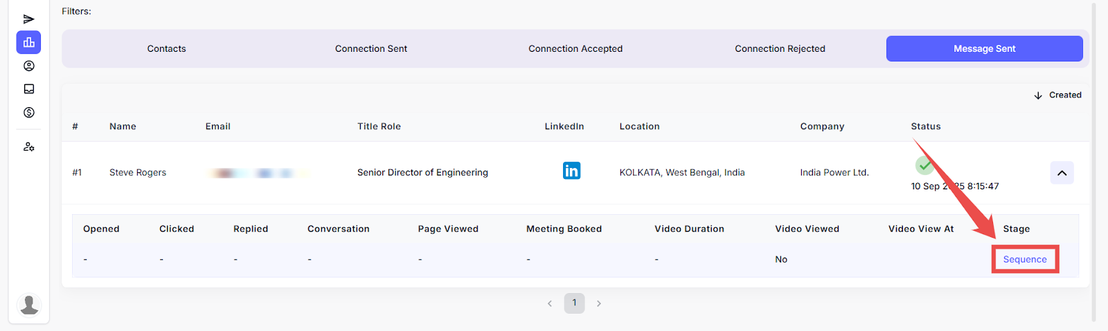 Step 7: Click on the Sequence option to view the complete outreach flow assigned to the lead.