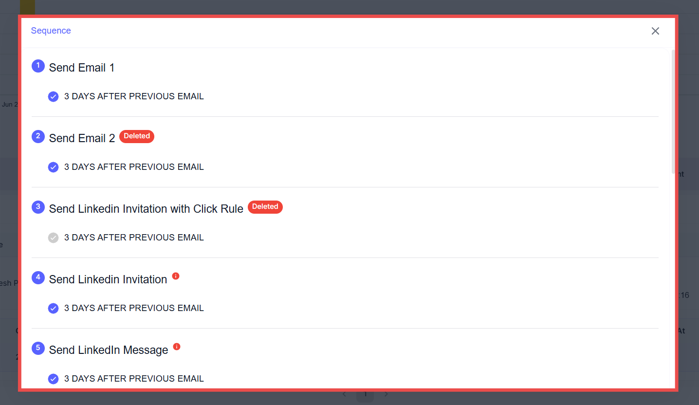 A modal window will appear displaying the detailed sequence of outreach steps scheduled for the selected lead, including emails, LinkedIn actions, delays between steps, and any deleted or pending activities.