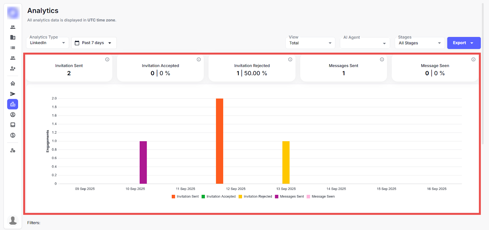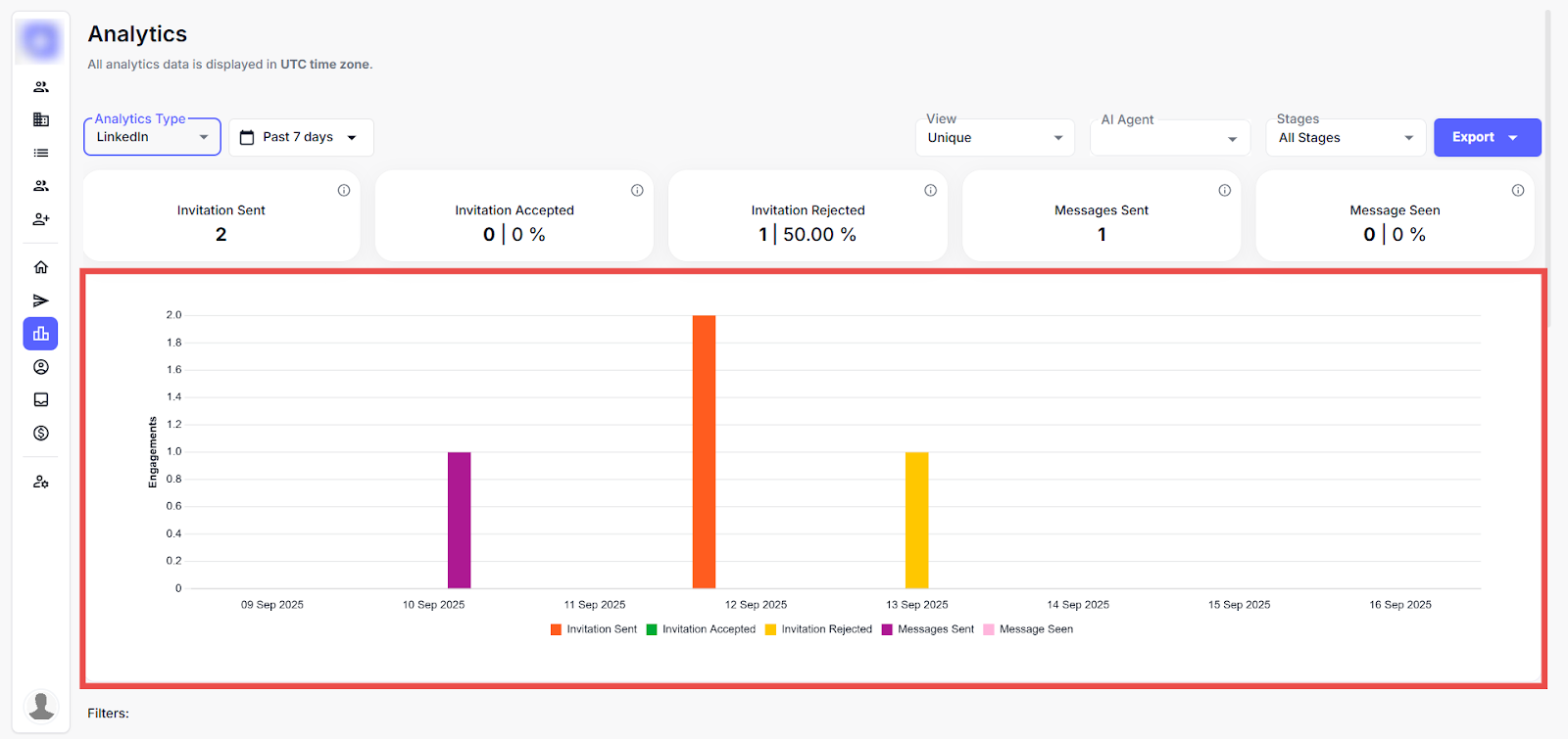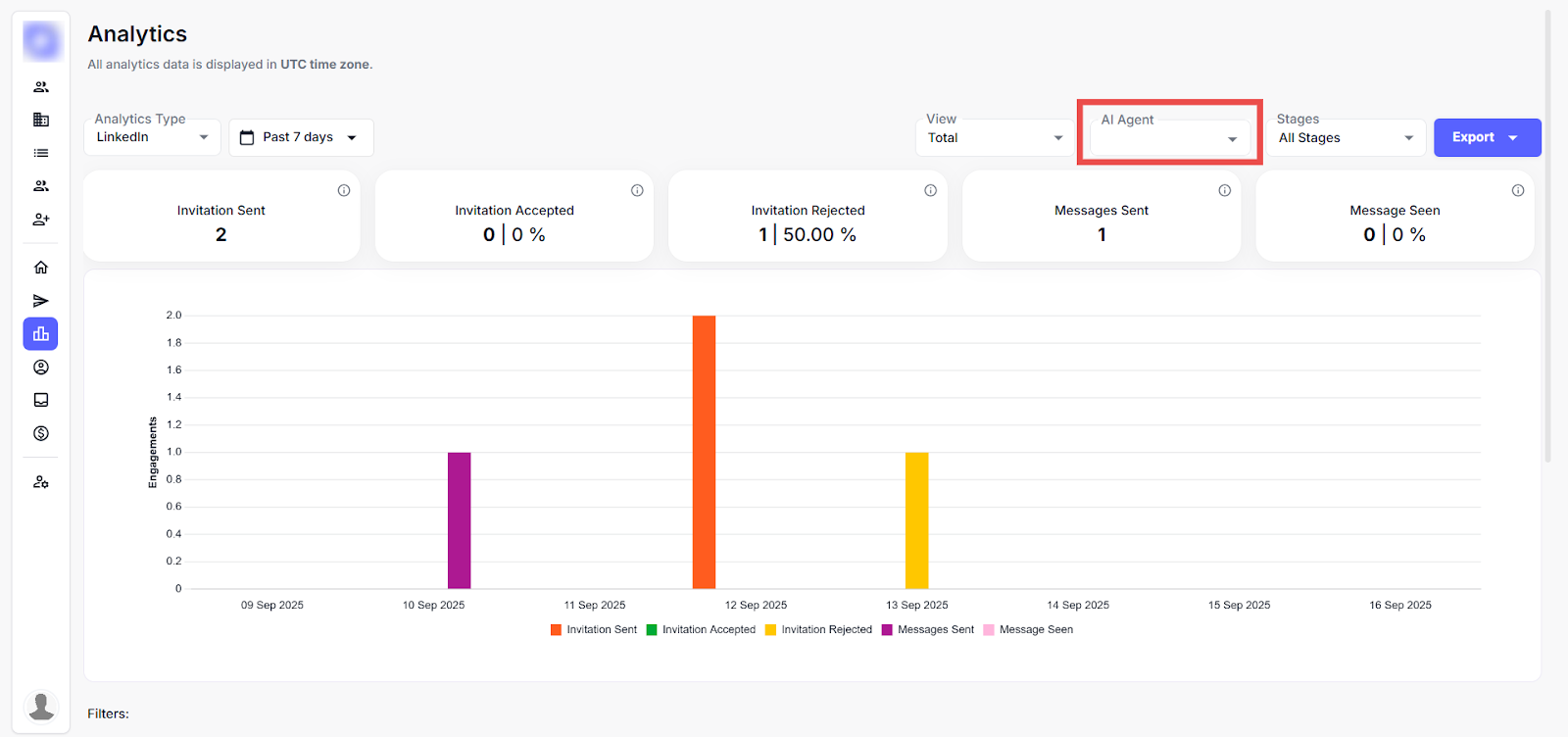This page offers a detailed view of LinkedIn outreach performance using key metrics, filterable timelines, and visual graphs to track leads, invitations, and messages over time. This applies filters by date or AI agent and switches views to analyse specific campaign trends.