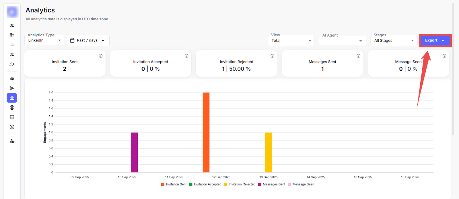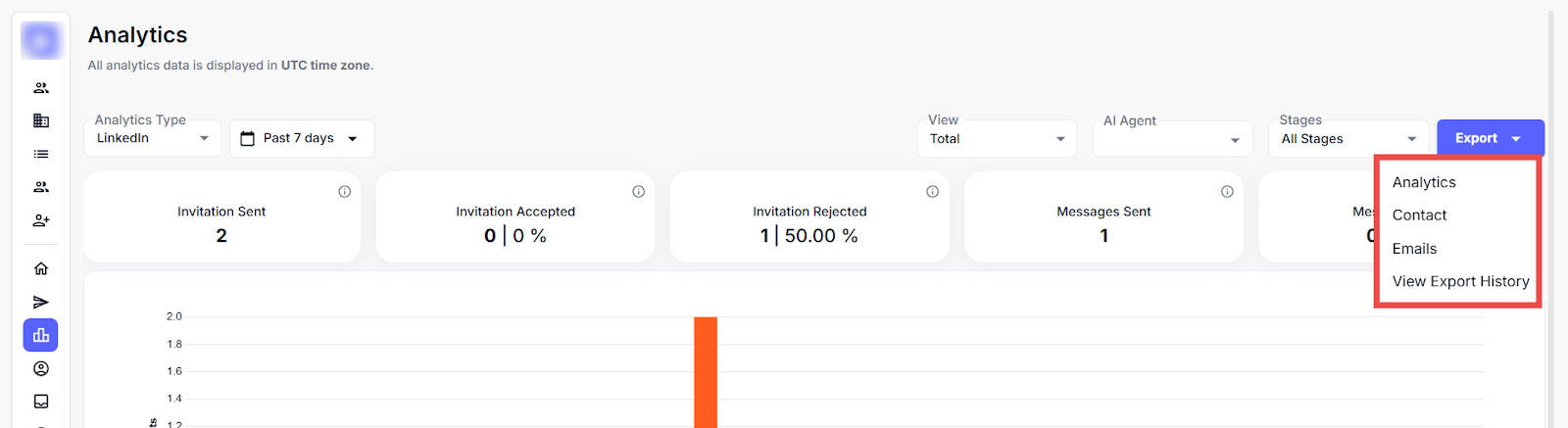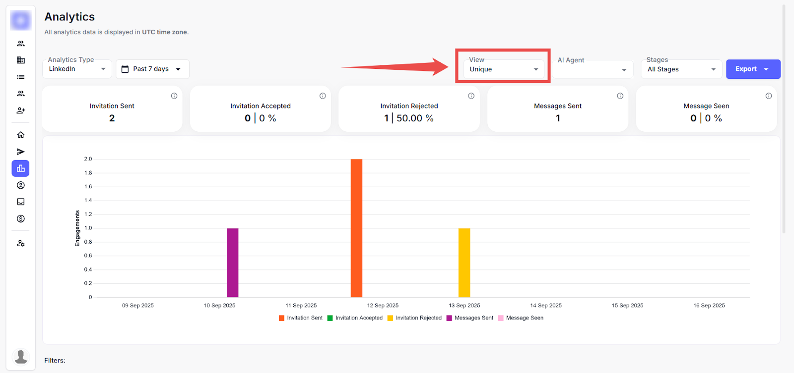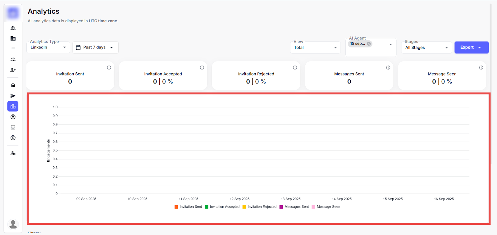 This page offers a detailed view of LinkedIn outreach performance using key metrics, filterable timelines, and visual graphs to track leads, invitations, and messages over time. This applies filters by date or AI agent and switches views to analyse specific campaign trends.