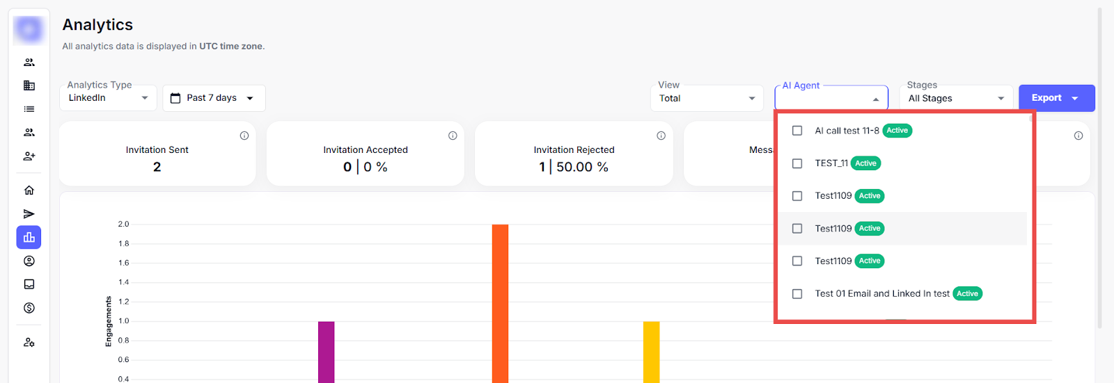 Step 2: Click on the AI Agent drop-down menu to filter analytics data based on a specific AI agent.