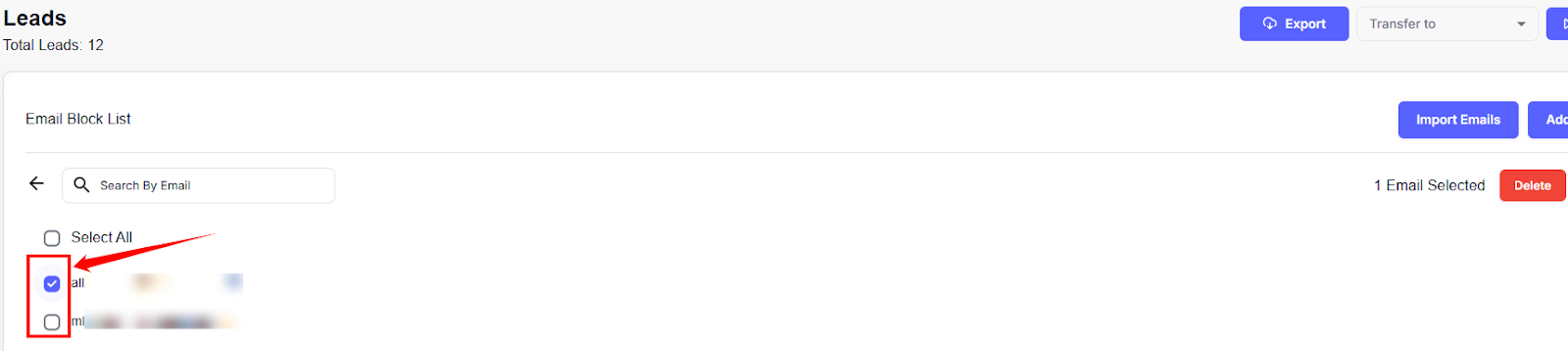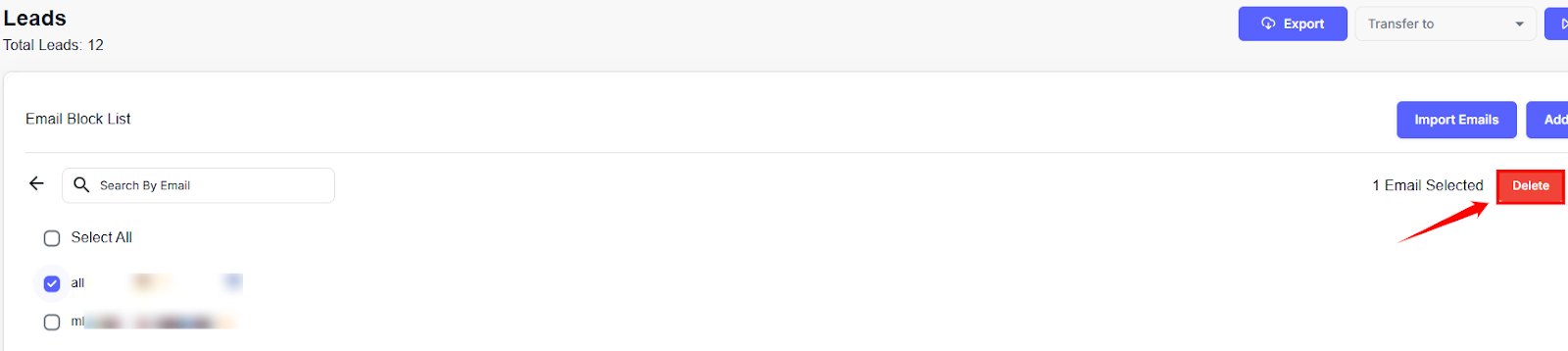 Maintaining a high-quality lead database is essential for effective email marketing and campaign performance. Once the email blocklist is added, you can manage unresponsive, invalid, or low-value email addresses by preventing them from receiving future communications. This helps protect your sender reputation, improve deliverability rates, and ensure your outreach efforts are targeted and efficient.